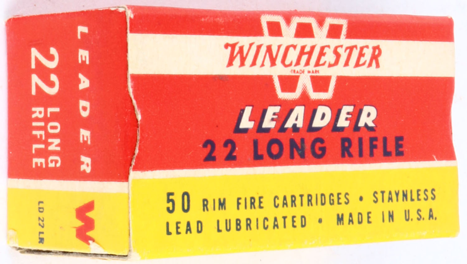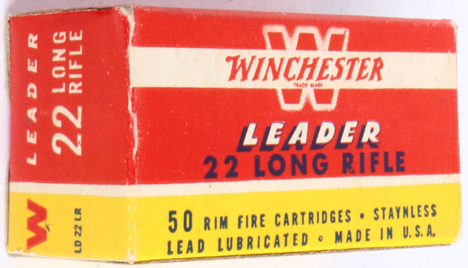 Winchester, Leader, .22 Long Rifle, Staynless, RHWeb: WRA-55 LR-2c, Full, 1pc. Red yellow & white box, box is near mint with excellent to minty color, only very minor corner wear, edges are crisp, end flaps are solid, ammo is excellent. Grade: Excellent ++ - Value: 6 to 30