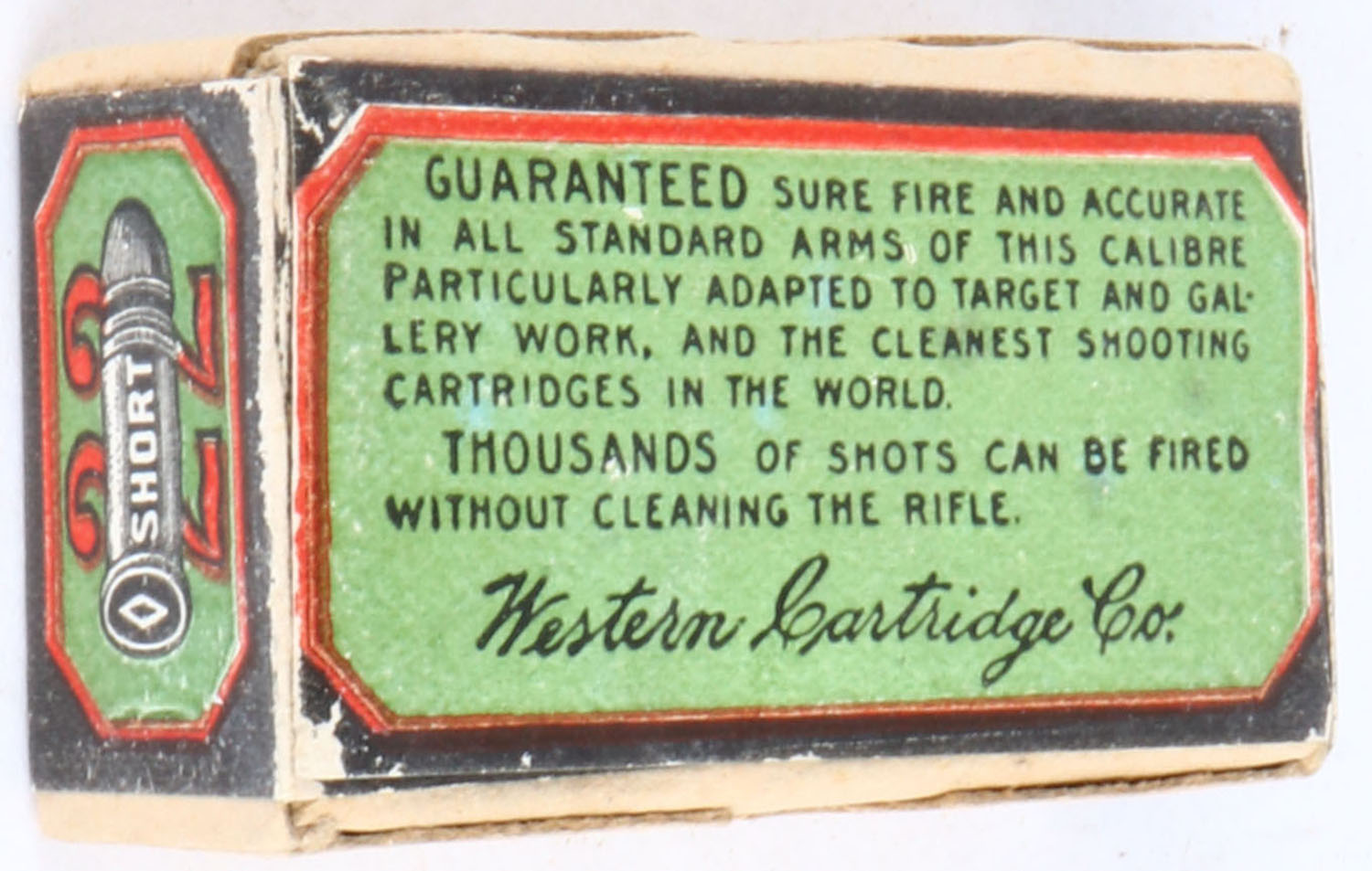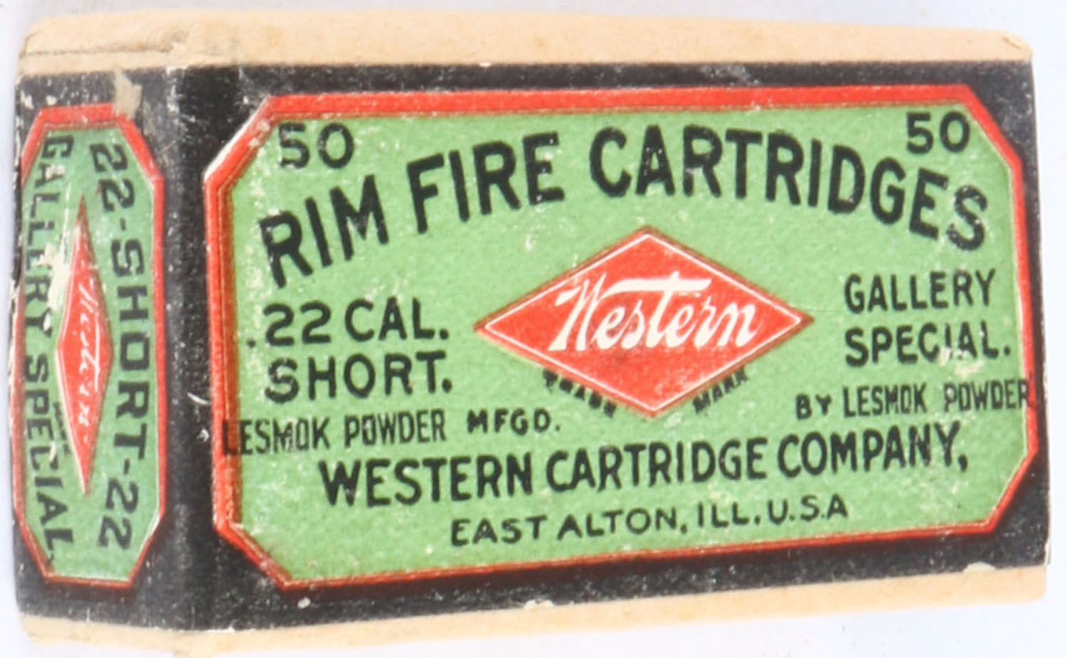 Western, Gallery Special, .22 Short, Lesmok Powder, RHWeb: WCC-48 S-4, FULL & SEALED, 2pc. Buff box with green & black wraparound label, box is solid with excellent color, very minor shelf & corner wear, edges are mostly crisp, label is intact. Grade: Excellent + - Value: 100 to 300