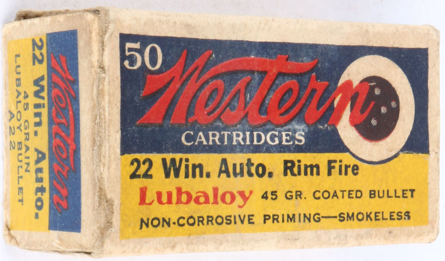 Western, .22 Win. Auto., 45 Grain Lubaloy Coated Bullet, RHWeb: WCC-5 WA-2a, Full, 1pc. Yellow blue & red bullseye box, left end flap is torn, box has very good color, some age soiling & color fading, some edge & corner wear, right end flap is solid, ammo is very good. Grade: Very Good + - Value: 4 to 40