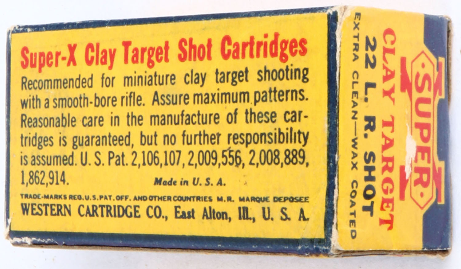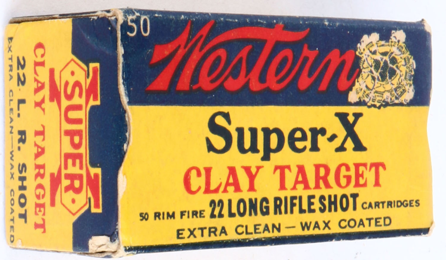 Western, Super-X, .22 Long Rifle Shot, Clay Target, RHWeb: WCC-Super-X Long Rifle-44 LRS-10, Full, 1pc. Yellow blue & red box, box is solid with excellent color, some edge & corner wear, very minor age soiling, end flaps are solid, ammo is excellent. Grade: Excellent - Value: 20 to 60