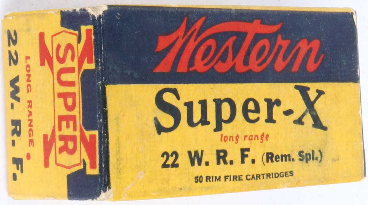 Western, Super-X, .22 W.R.F. (Rem. Spl.), RHWeb: WCC-Super-X W.R.F.-8 WRF-13, Full, 1pc. Yellow blue & red box, box is solid with very good to excellent color, minor age soiling & shelf wear, very minor corner wear, edges are mostly crisp, end flaps are solid, ammo is excellent. Grade: Excellent - Value: 8 to 40