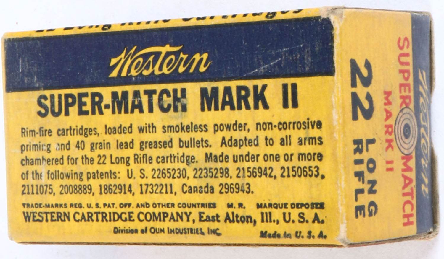 Western, Super Match Mark II, .22 Long Rifle, RHWeb: WCC-51.2 LR-3e, Full, 1pc. Yellow blue & red box, box is solid with very good to excellent color, minor age soiling, very minor corner wear, edges are mostly crisp, end flaps are solid, ammo is excellent to minty. Grade: Excellent + - Value: 10 to 50