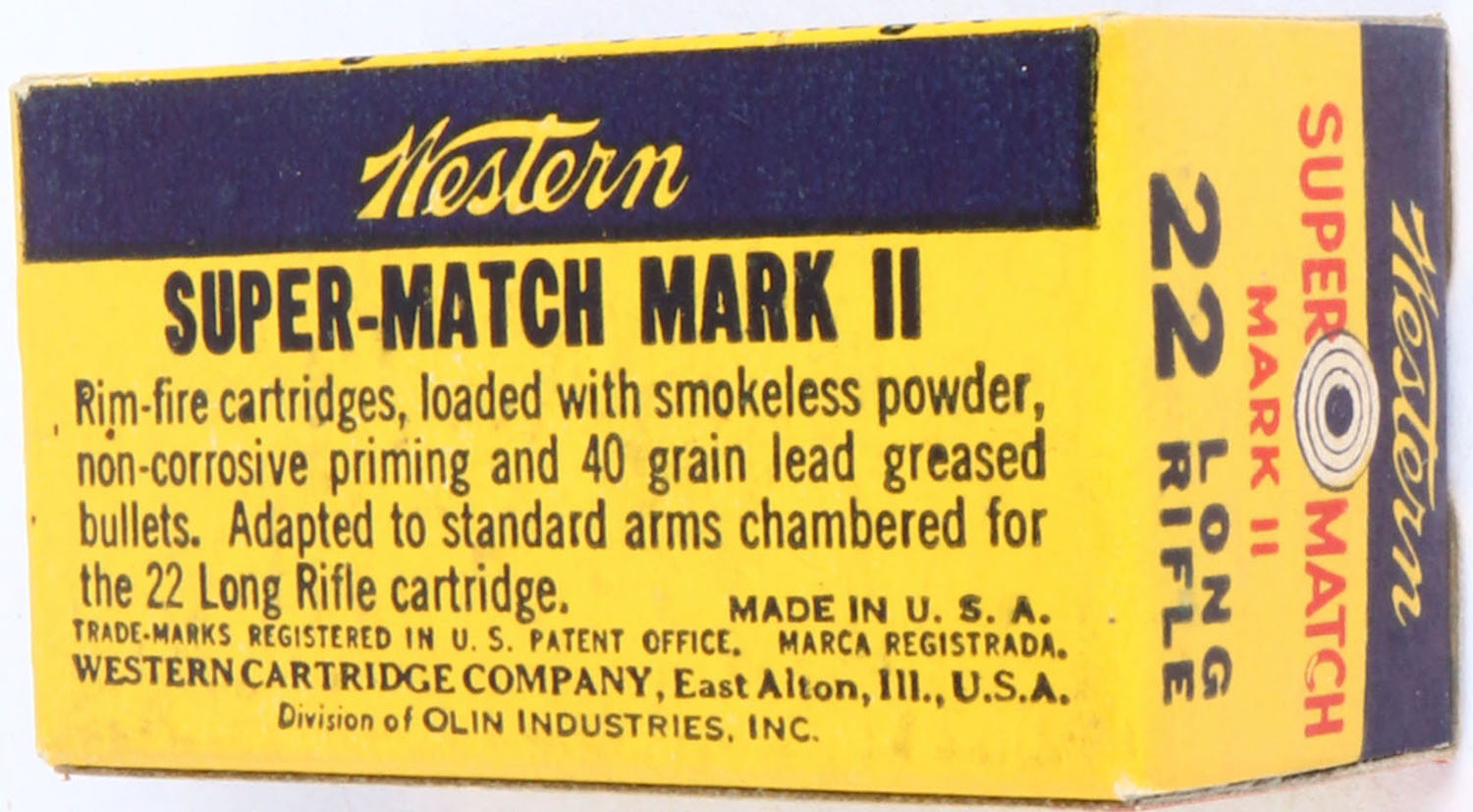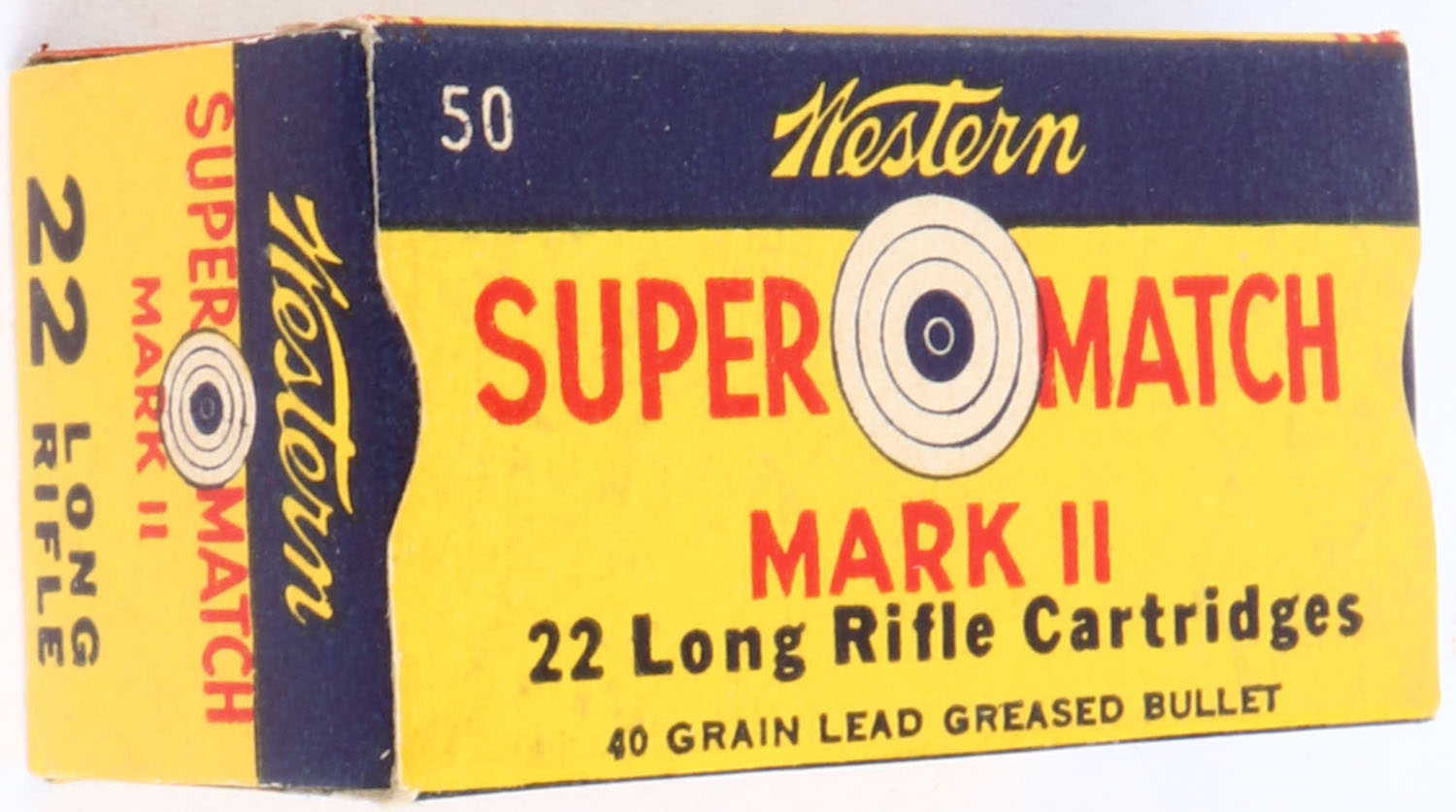 Western, Super Match Mark II, .22 Long Rifle, RHWeb: WCC-51.2 LR-3g, Full, 1pc. Yellow blue & red box, box is MINT with minty color, corners are sharp, edges are crisp, end flaps are solid, ammo is excellent to minty. Grade: MINT - Value: 20 to 60