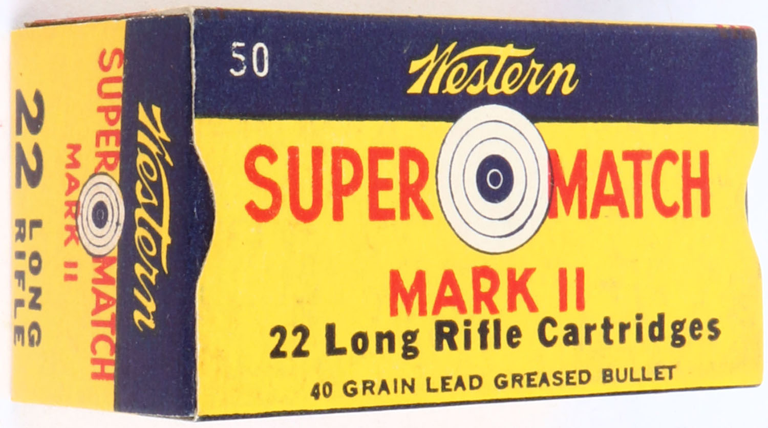 Western, Super Match Mark II, .22 Long Rifle, RHWeb: WCC-51.2 LR-3g, Full, 1pc. Yellow blue & red box, box is MINT with minty color, corners are sharp, edges are crisp, end flaps are solid, ammo is excellent to minty. Grade: MINT - Value: 20 to 60