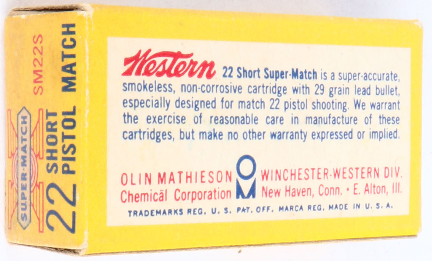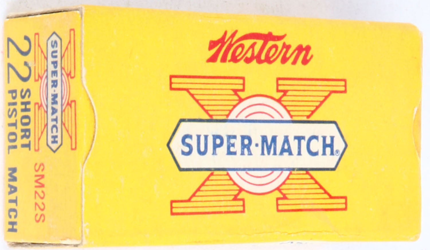 Western, Super-Match, .22 Short, Pistol Match, RHWeb: WCC-51.5, Full, 1pc. Yellow white & red box, box is solid with excellent color, very minor age soiling, corners are mostly sharp, edges are mostly crisp, end flaps are solid, ammo is excellent. Grade: Excellent + - Value: 10 to 50