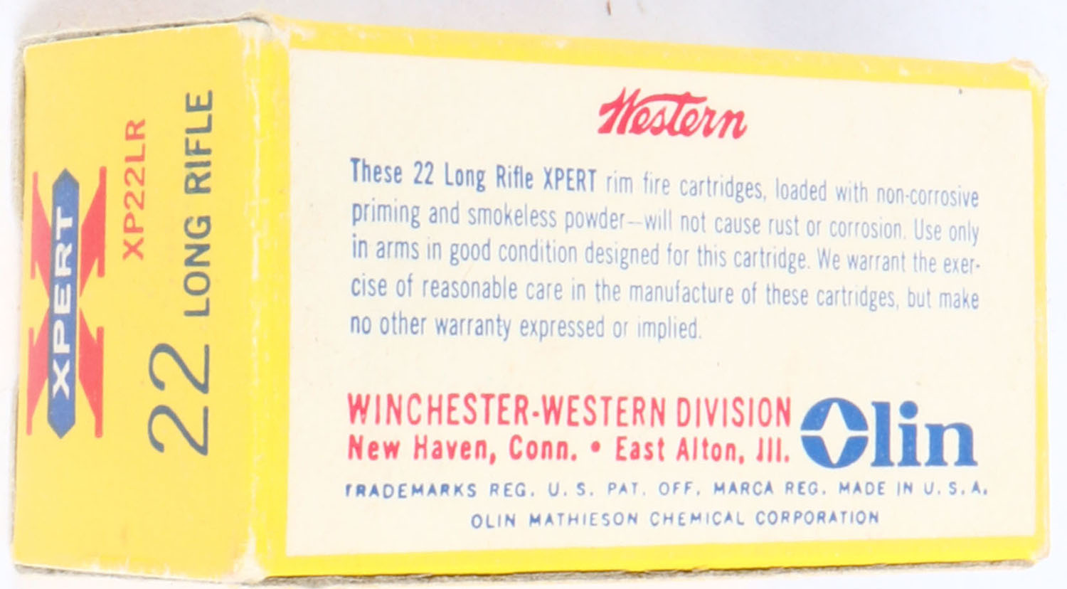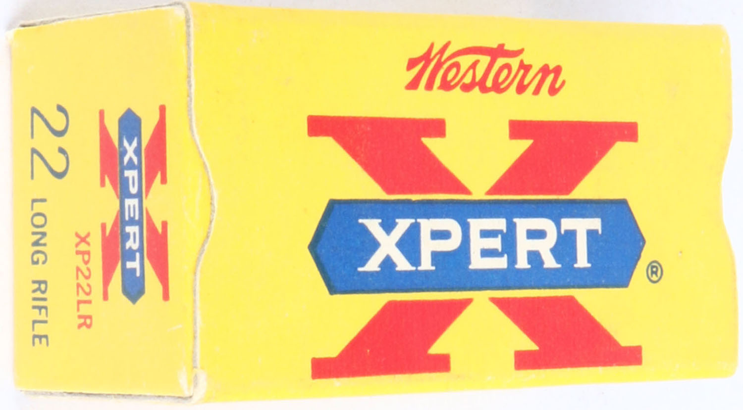 Western, Xpert, .22 Long Rifle, RHWeb: WCC-52 LR-2b, Full, 1pc. Yellow red & blue box, box is MINT with minty color, corners are sharp, edges are crisp, end flaps are solid, ammo is excellent. Grade: MINT - Value: 10 to 50