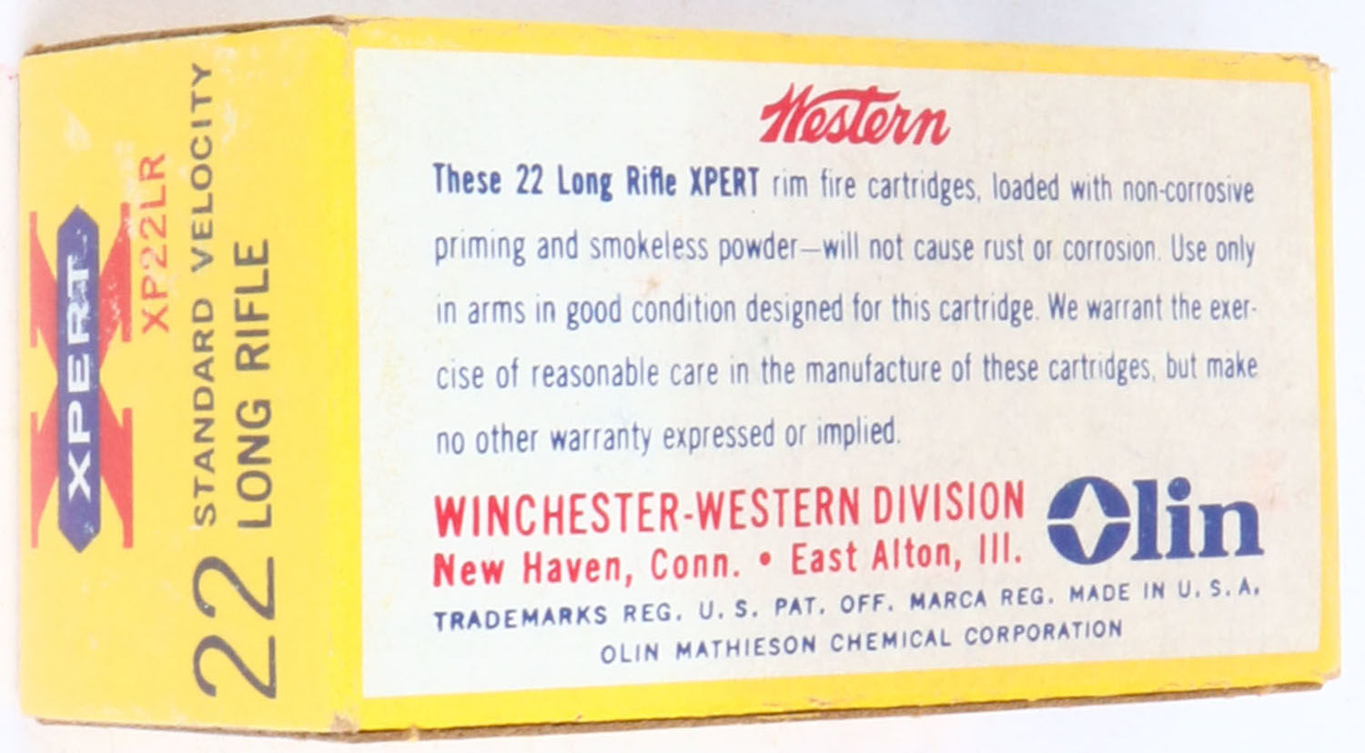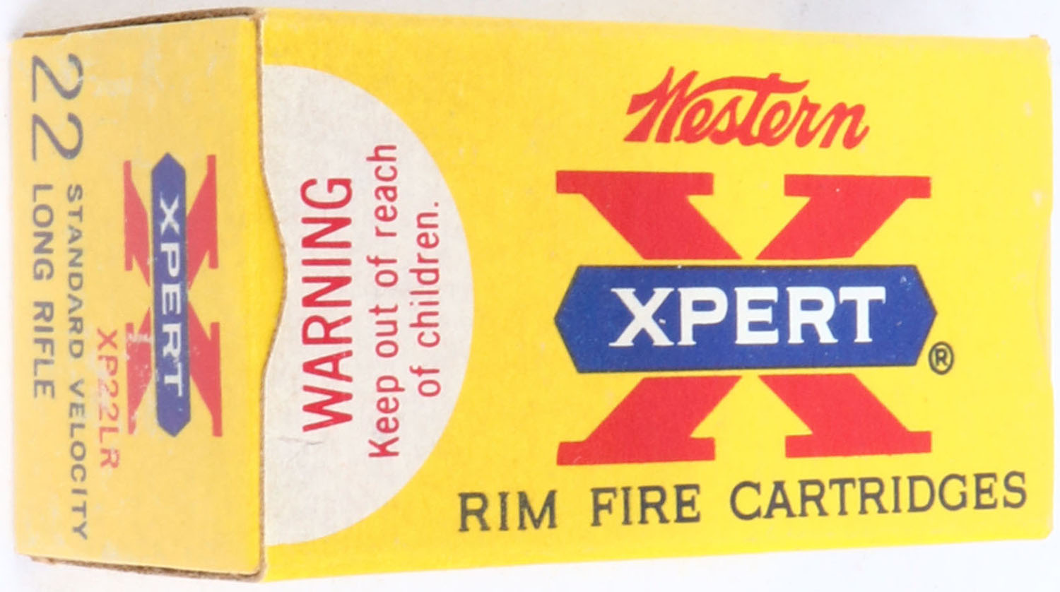 Western, Xpert, .22 Long Rifle, Standard Velocity, RHWeb: WCC-52 LR-3a, Full, 1pc. Yellow white & red box, box is solid with excellent color, very minor age soiling, corners are sharp, edges are crisp, end flaps are solid, ammo is excellent. Grade: Excellent ++ - Value: 6 to 30