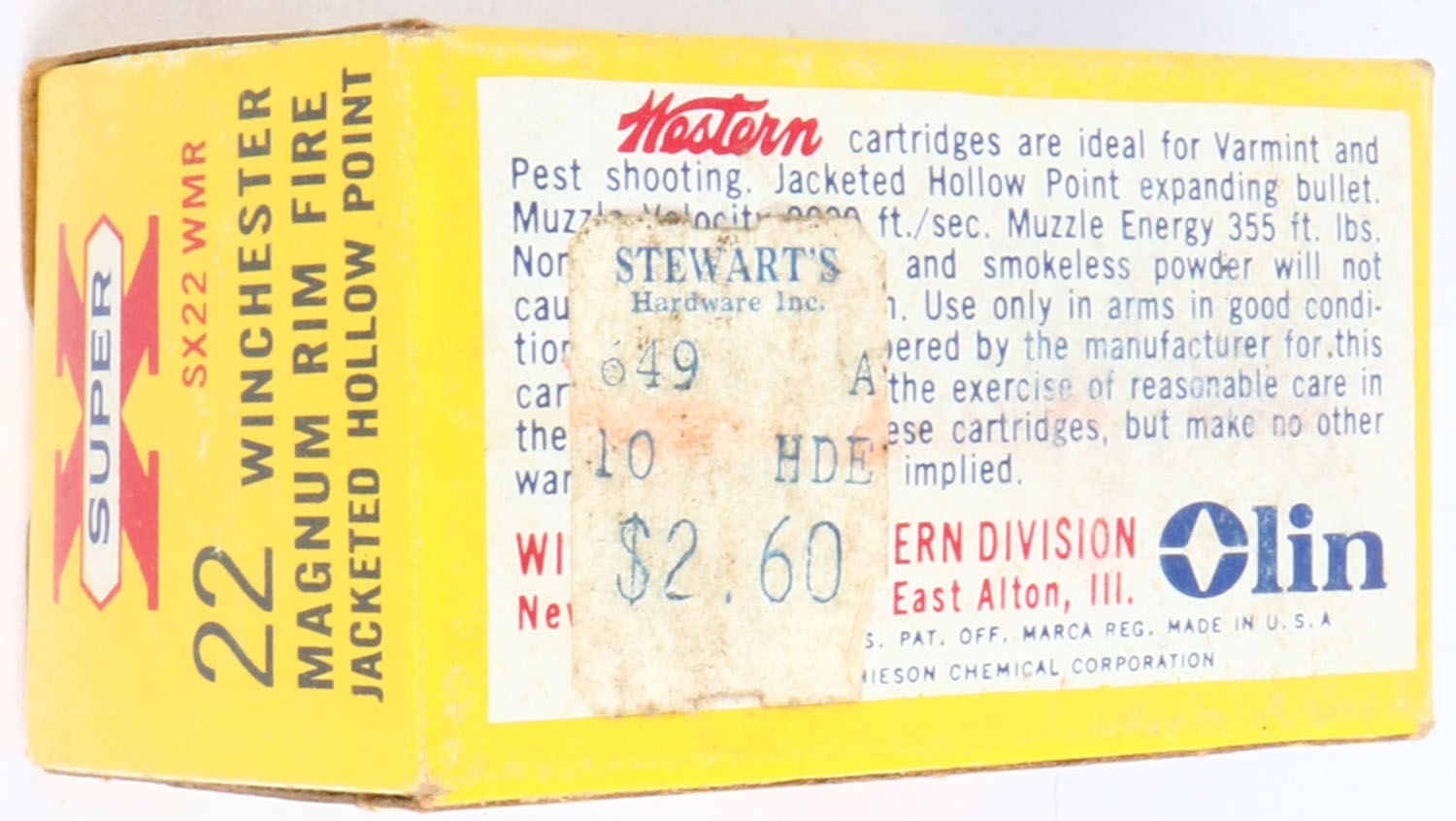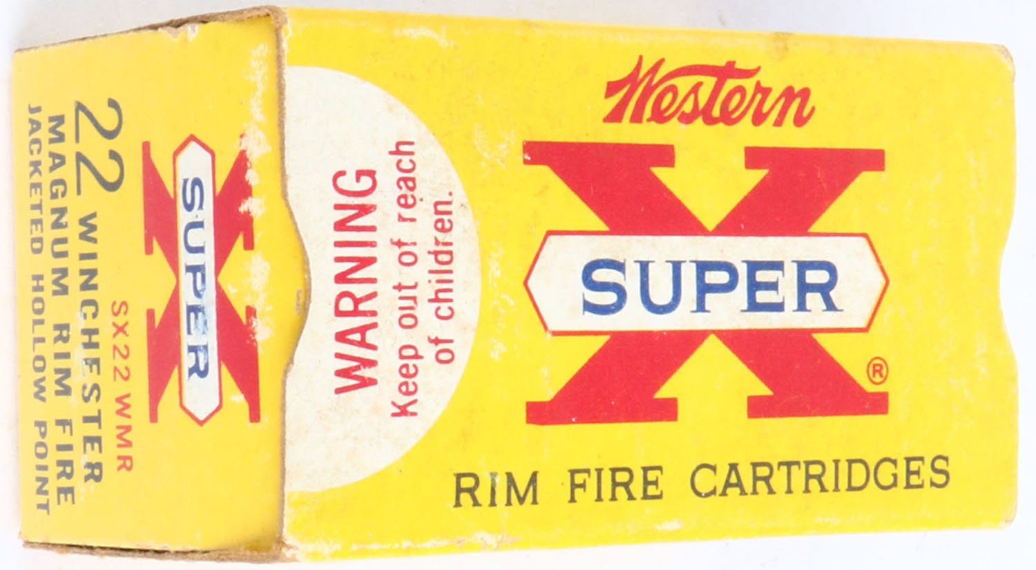 Western, Super X, .22 Winchester Magnum Rim Fire, Jacketed Hollow Point, RHWeb: WCC-12 WMR-1a, Full, 1pc. Yellow white & red box, box is solid with excellent color, very minor age soiling, very minor shelf & corner wear, edges are mostly crisp, end flaps are solid, ammo is excellent. Grade: Excellent - Value: 8 to 40