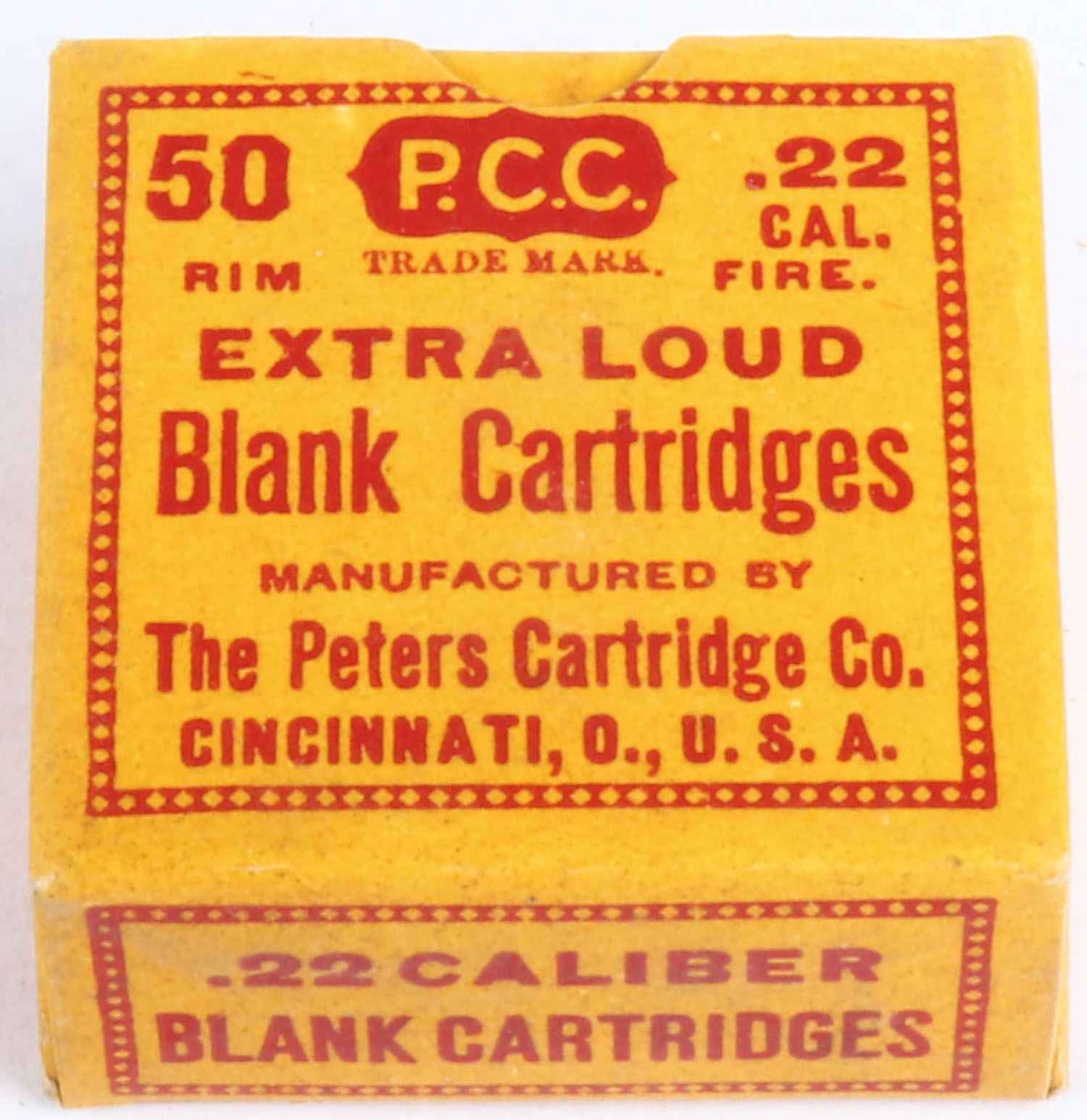 Peters, Extra Loud Blank Cartridges, .22 cal., RHWeb: PCC-2 SB-2, Full, 1pc. Yellow & red box, box is near mint with excellent to minty color, only very minor corner wear, edges are crisp, flaps are solid, ammo is excellent. Grade: Excellent ++ - Value: 4 to 20
