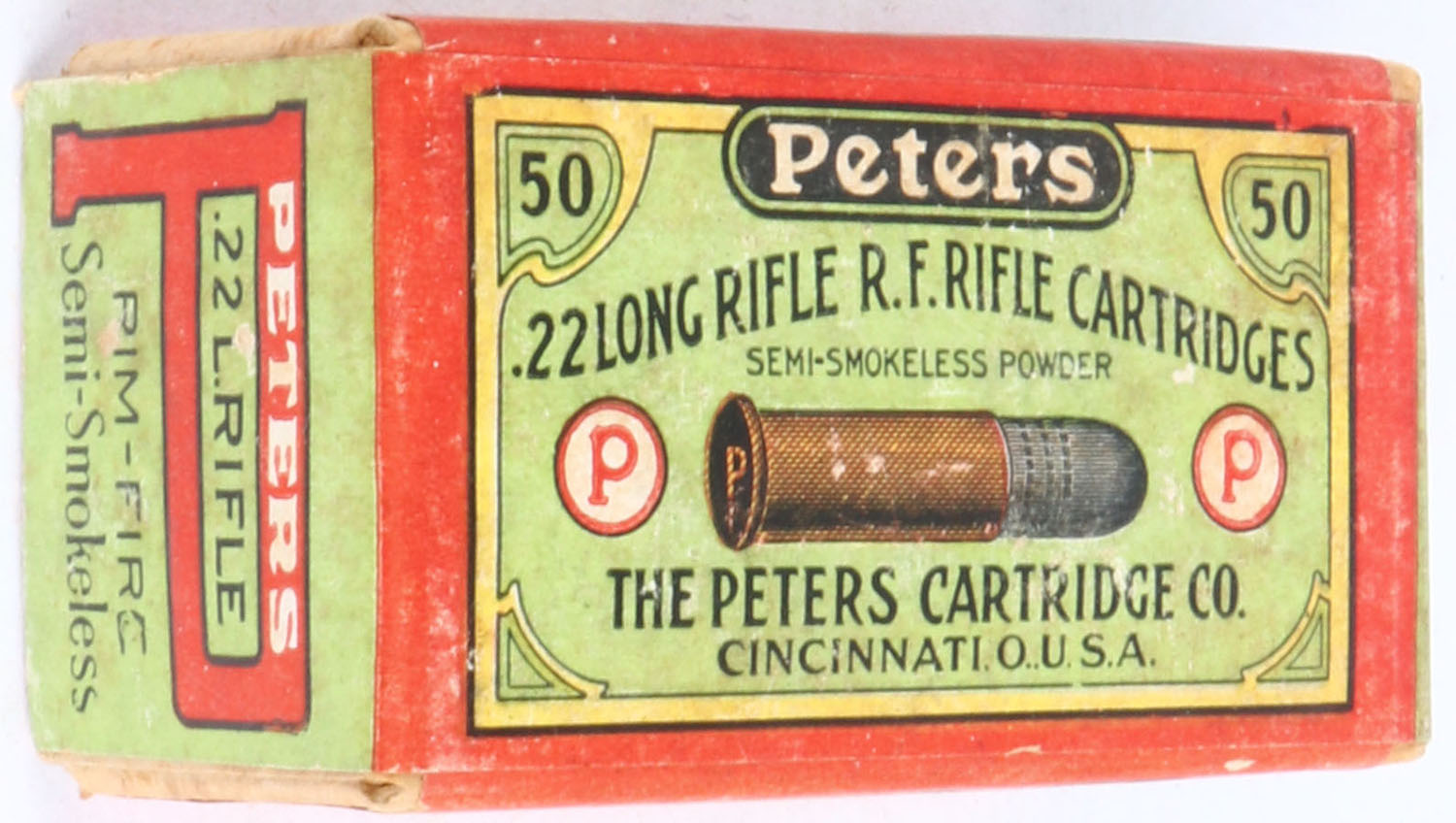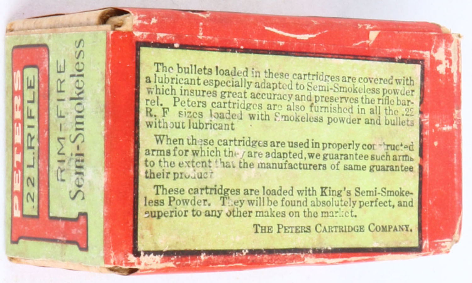 Peters, .22 Long Rifle, Semi-Smokeless Powder, RHWeb: PCC-5A LR-1a, FULL & SEALED, 2pc. Buff box with multi-colored full wraparound label, box is solid with very good to excellent color, very minor age soiling & color fading, very minor shelf wear, corners are mostly sharp, edges are crisp, label is intact. Grade: Excellent + - Value: 50 to 150