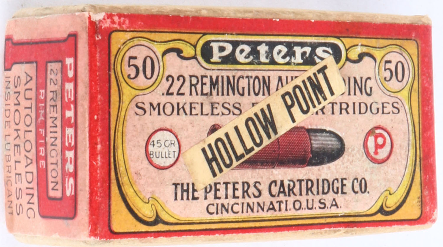 Peters, Smokeless R.F. Cartridges, .22 Remington Autoloading Hollow Point, RHWeb: PCC-5A RA-2a, Full, 2pc. Buff box with pink & red wraparound label, white ''Hollow Point'' over-label, box is solid with excellent color, some age soiling, some shelf wear especially to the bottom, very minor edge & corner wear, label is intact, ammo is very good. Grade: Excellent - Value: 100 to 300