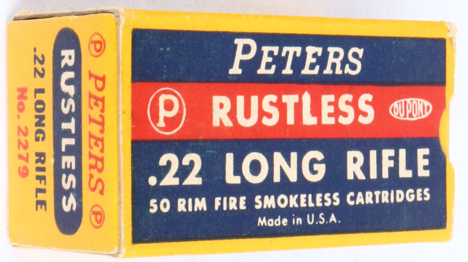 Peters, Rustless, .22 Long Rifle, Kings Mills Ohio, RHWeb: PCC-8D LR-3f, Full, 1pc. Blue yellow & red box, box is near mint with minty color, only very minor corner wear, edges are crisp, end flaps are solid, ammo is excellent. Grade: Excellent ++ - Value: 10 to 40