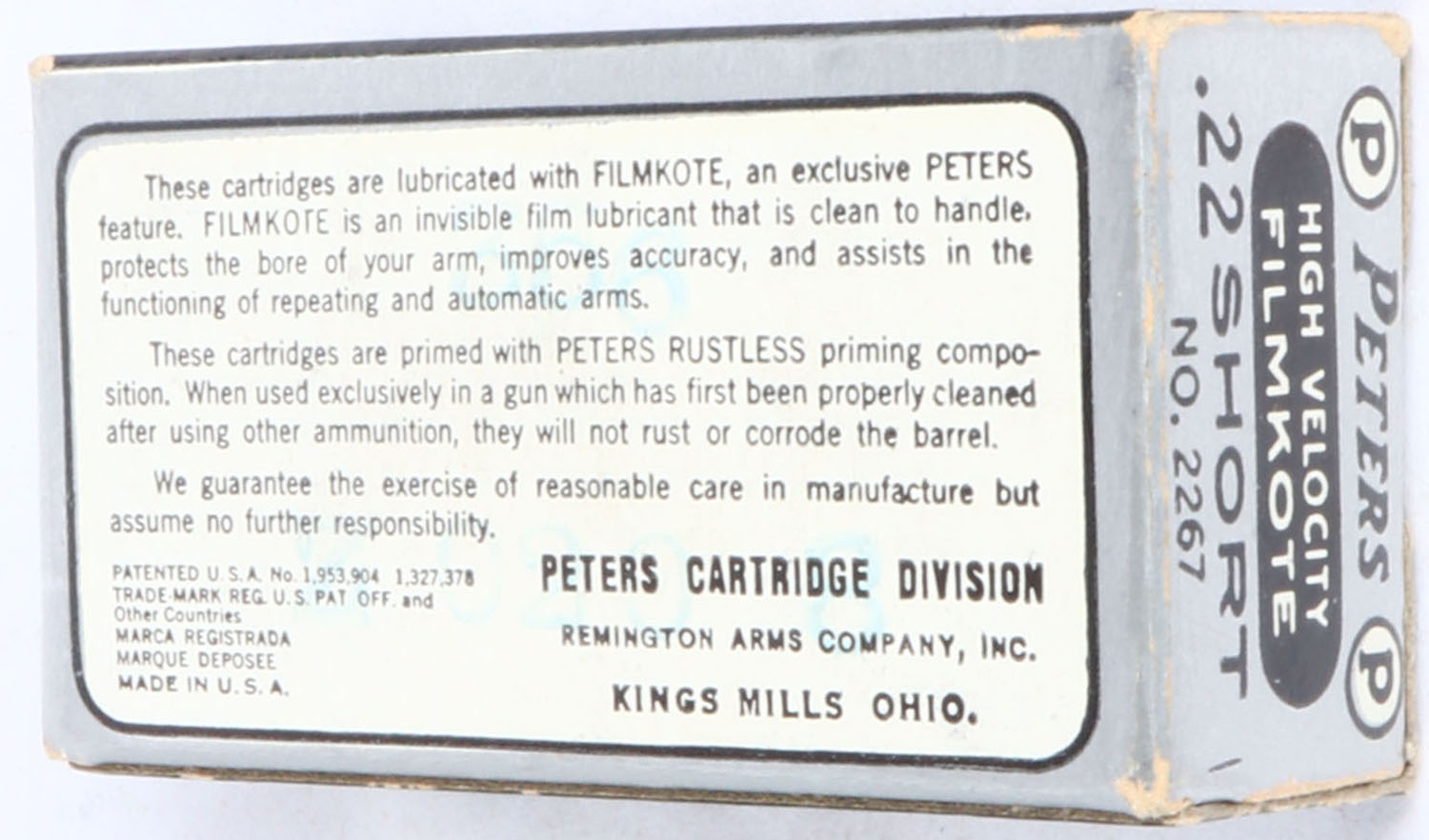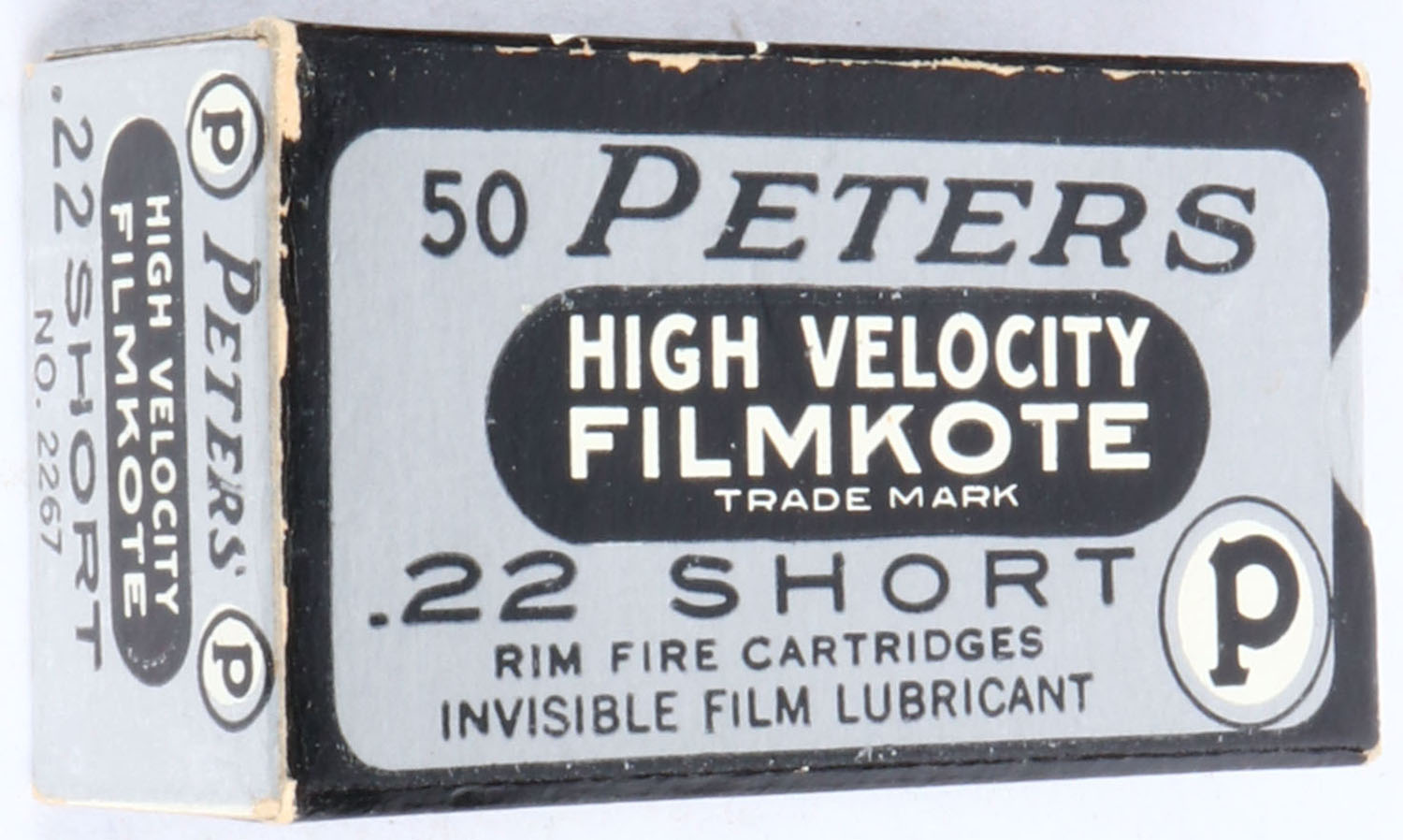 Peters, High Velocity Filmkote, .22 Short, RHWeb: PCC-13 S-1g, Full, 1pc. Silver black & white box, box is solid with excellent to minty color, very minor edge & corner wear, end flaps are solid, ammo is excellent. Grade: Excellent + - Value: 10 to 50
