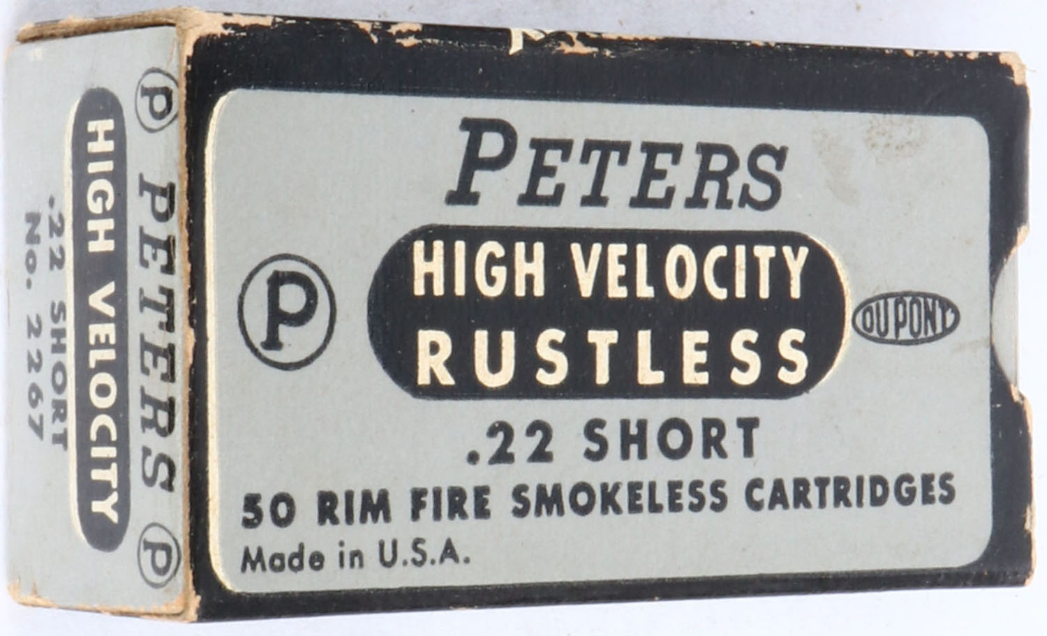 Peters, High Velocity Rustless, .22 Short, RHWeb: PCC-14 S-1aa, Full, 1pc. Silver black & white box, box is solid with excellent color, minor edge & corner wear, end flaps are solid, ammo is excellent. Grade: Excellent + - Value: 10 to 40