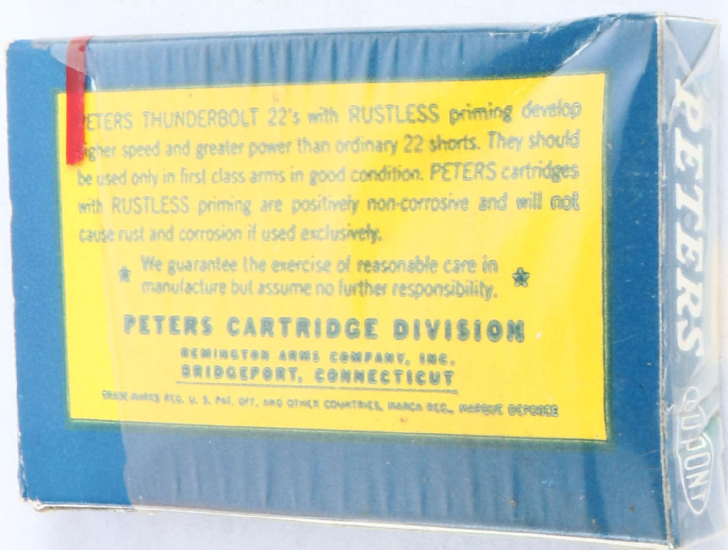 Peters, ''Thunderbolt'', .22 Short, RHWeb: PCC-17 S-5, Full, 1pc. Blue yellow & white box, box is solid with very good color, some color fading & edge wear, corners are mostly sharp, box is warped, ammo is minty. Grade: Very Good ++ - Value: 20 to 60