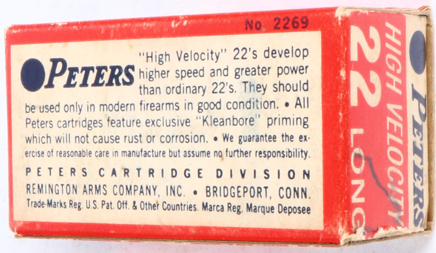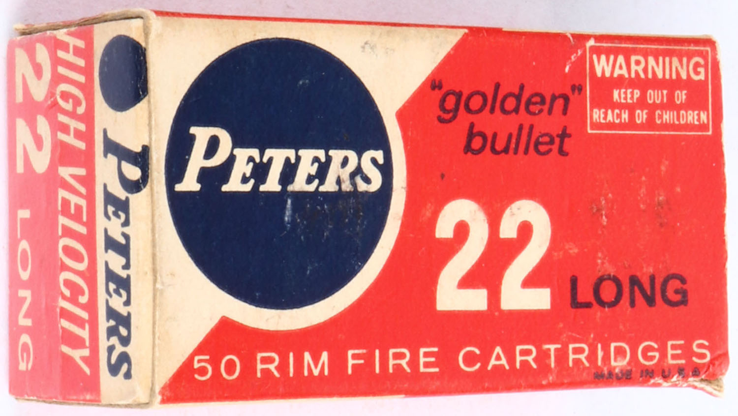 Peters, ''golden'' bullet, .22 Long, RHWeb: PCC-20 L-1a, Full, 1pc. Red white & blue box, box is solid with very good to excellent color, some age soiling & corner wear, edges are crisp, end flaps are solid, ammo is excellent. Grade: Excellent - Value: 6 to 30