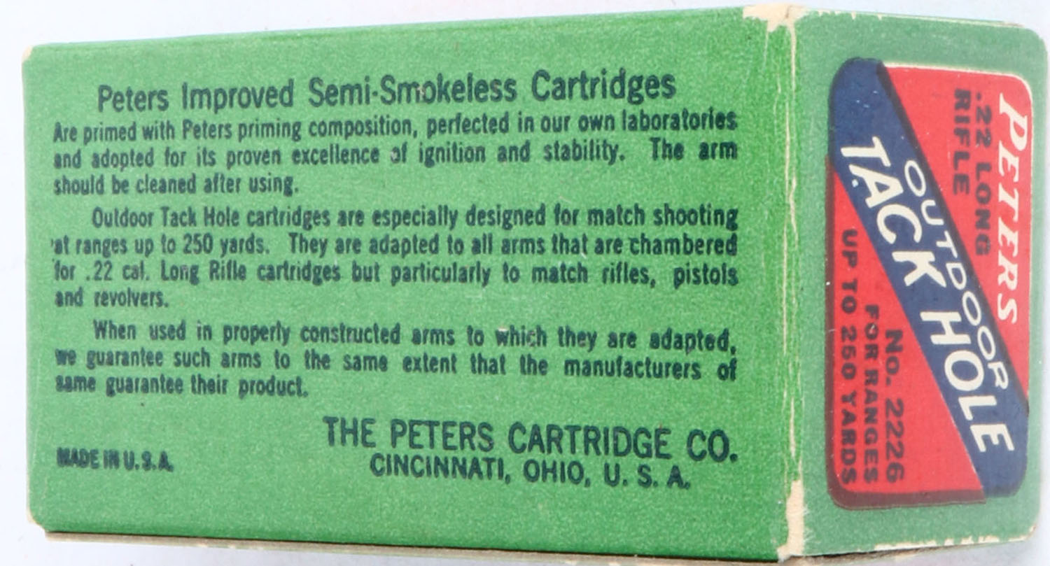 Peters, Outdoor Tack Hole, .22 Long Rifle, Improved Semi-Smokeless, RHWeb: PCC-52 LR-10, Full, 1pc. Red green & blue box, box is solid with excellent to minty color, minor edge & corner wear, end flaps are solid, ammo is excellent. Grade: Excellent + - Value: 50 to 100