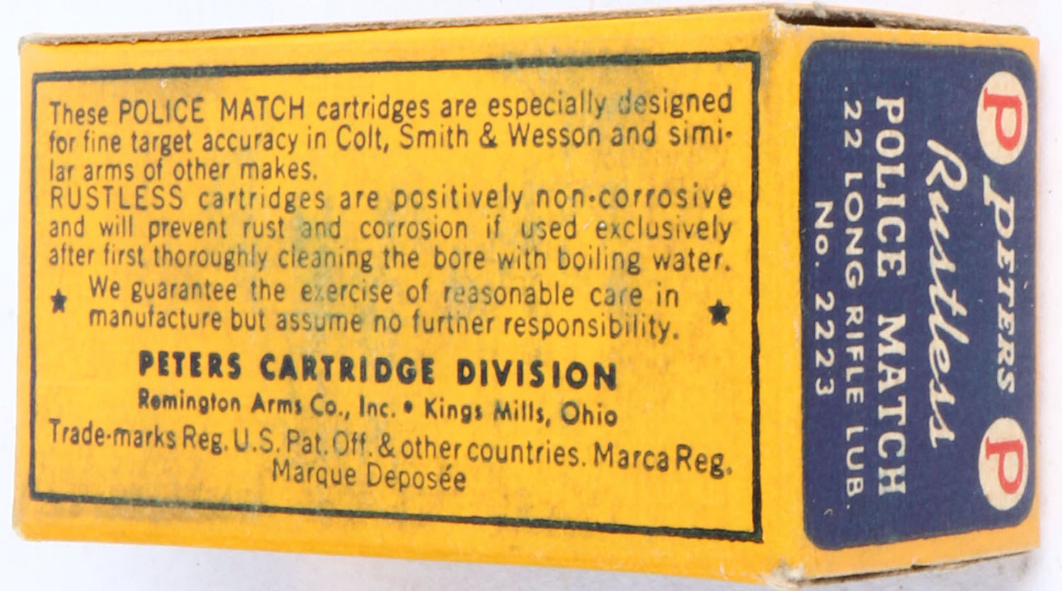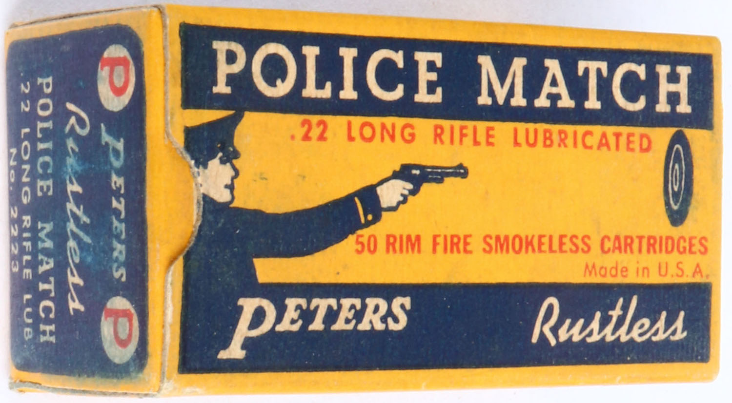 Peters, Police Match, .22 Long Rifle, RHWeb: PCC-53C LR-1a, Full, 1pc. Yellow blue & white box, box is solid with excellent color, very minor age soiling, corners are mostly sharp, edges are crisp, end flaps are solid, ammo is excellent. Grade: Excellent + - Value: 50 to 100