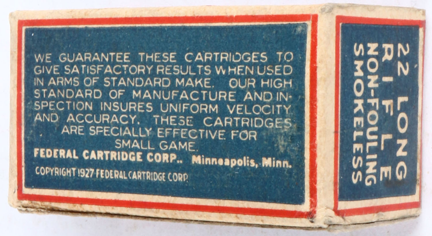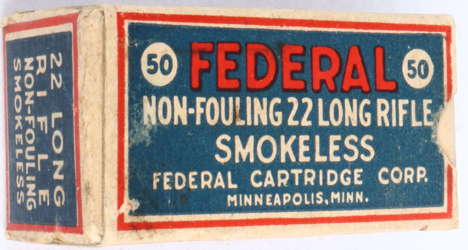 Federal, Non-Fouling, .22 Long Rifle, Smokeless, RHWeb: FCC-2 LR-3.5, Full, 1pc. Blue red & white box, box is solid with very good to excellent color, minor age soiling & shelf wear, very minor corner wear, edges are mostly crisp, end flaps are solid, ammo is good to very good. Grade: Excellent - Value: 100 to 300