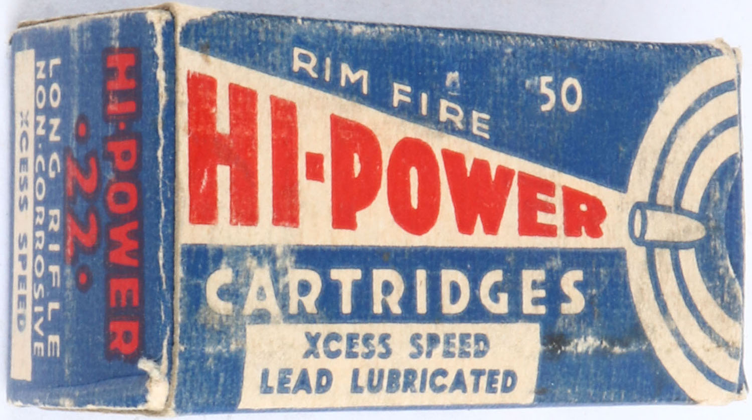 Federal, Hi-Power, .22 Long Rifle, RHWeb: FED-5 LR-1a, Partial 49rds., 1pc. Blue white & red box, box is solid with very good color, some age soiling, shelf wear, minor edge & corner wear, end flaps are solid, tape on bottom, ammo is excellent. Grade: Very Good - Value: 4 to 20