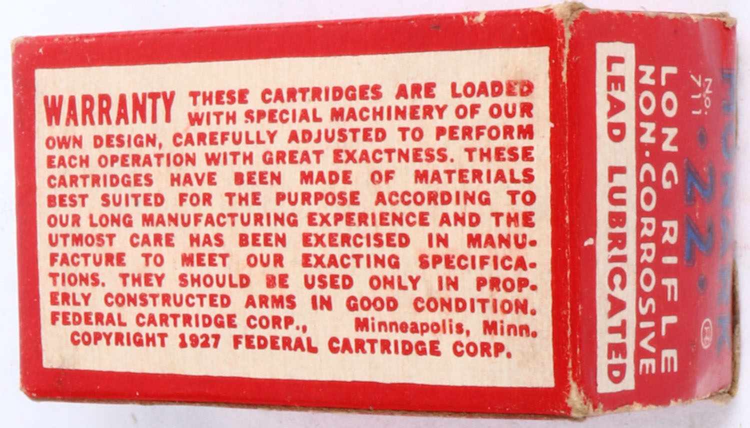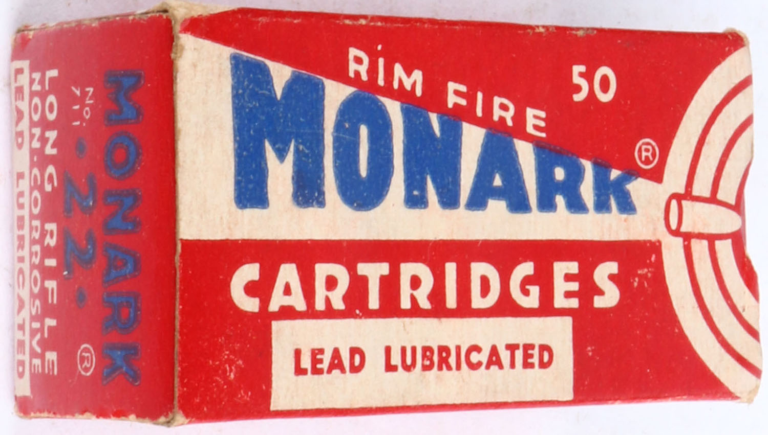 Federal, Monark, .22 Long Rifle, RHWeb: FED-6 LR-4e, Full, 1pc. Red white & blue box, box is solid with excellent color, very minor age soiling & corner wear, edges are crisp, end flaps are solid, ammo is very good to excellent. Grade: Excellent - Value: 6 to 30