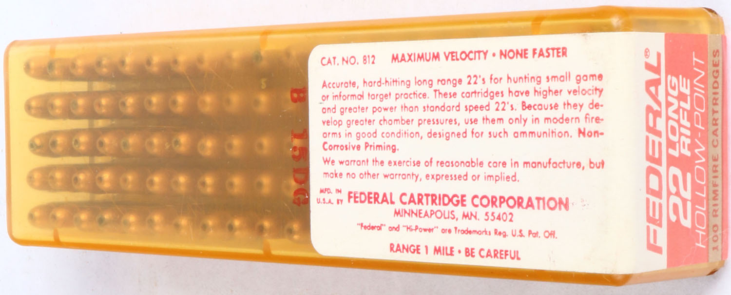 Federal, Hi-Power 100's, .22 Long Rifle Hollow Point, RHWeb: FED-11 LR-2b, FULL & SEALED, 2pc. Amber plastic tray with red white & gold sealing label, box is solid, label is intact with very good to excellent color, very minor color fading, ammo appears mint. Grade: Excellent + - Value: 8 to 40