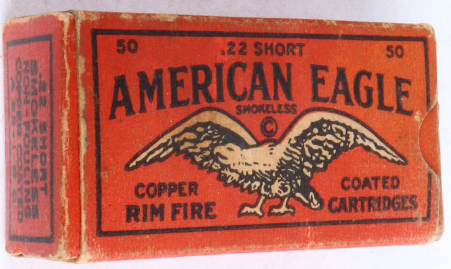 American, American Eagle, .22 Short, Copper Coated, Non-Fouling, RHWeb: ACC-1 S-2b, Partial 48rds., 1pc. Red black & white box, box is solid with very good color, some age soiling, color fading, minor edge & corner wear, end flaps are solid, ammo is very good. Grade: Very Good ++ - Value: 50 to 150