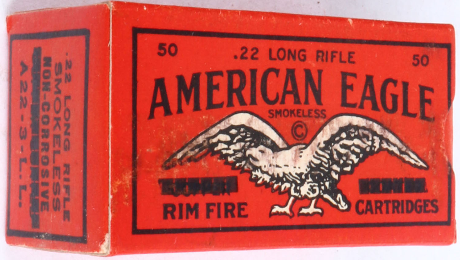 American, American Eagle, .22 Long Rifle, A22-3 - L.L., RHWeb: ACC-1 LR-3.1 (no h/s on a brass case), Full, 1pc. Red black & white box, box is solid with excellent color, some staining to top, very minor corner wear, edges are crisp, end flaps are solid, ammo is excellent. Grade: Excellent + - Value: 30 to 120