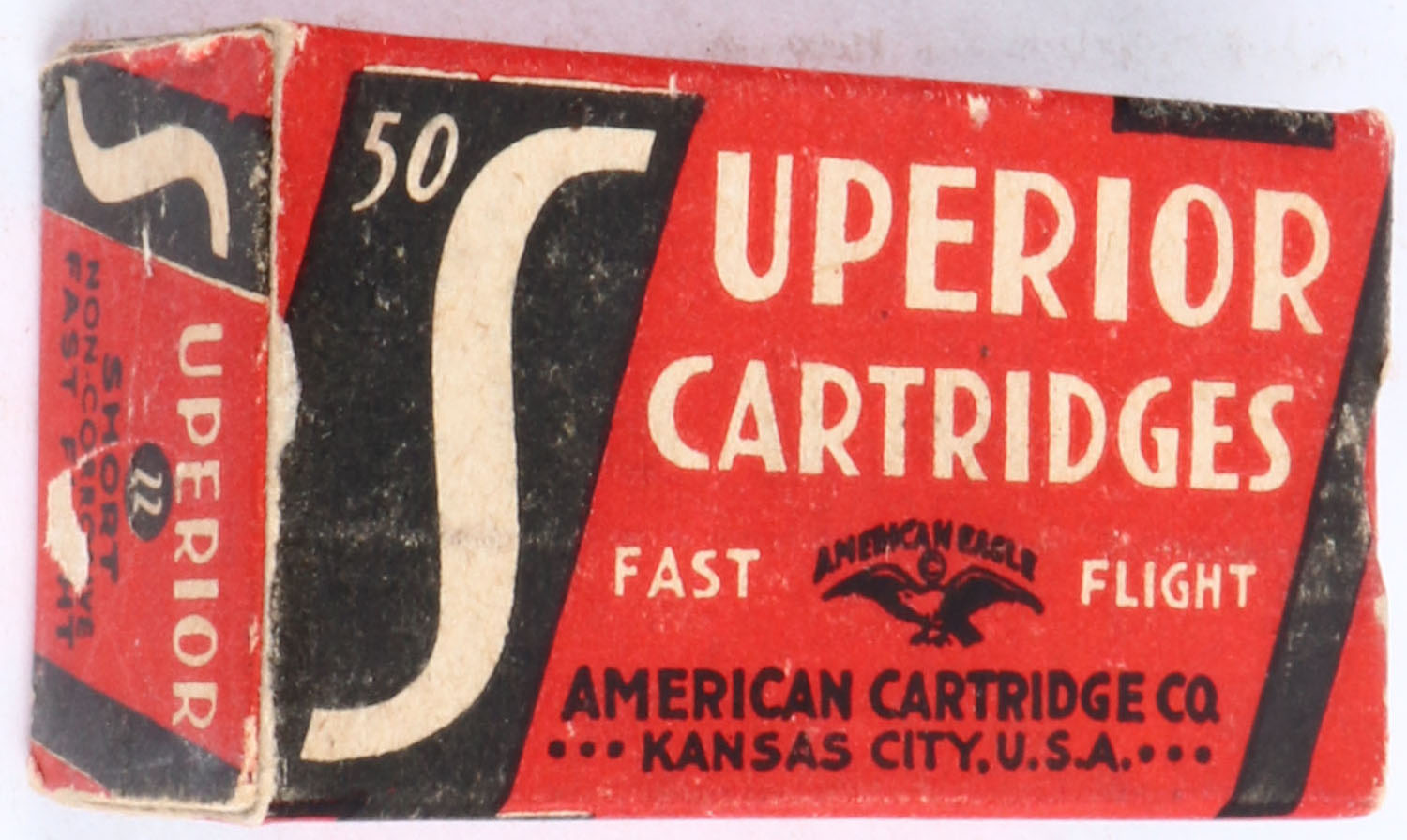 American, Superior Cartridges, .22 Short, RHWeb: ACC-2 S-1a, Full, 1pc. Red white & black box, box is solid with very good to excellent color, some age soiling & shelf wear, minor corner wear, edges are mostly crisp, end flaps are solid, ammo is very good. Grade: Excellent - Value: 10 to 40