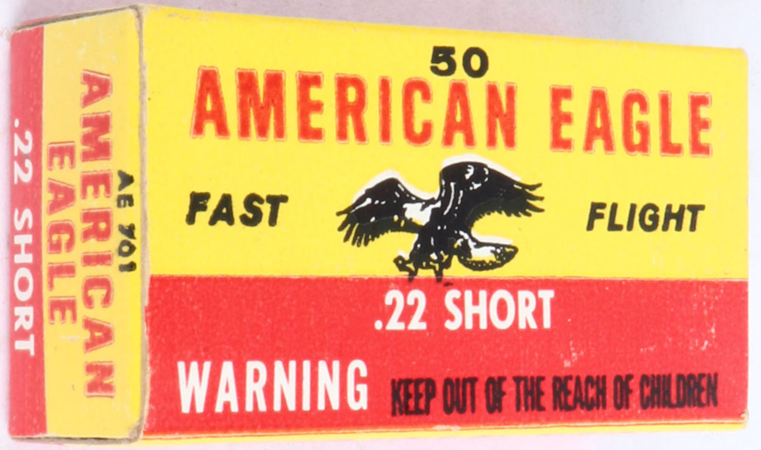 American, American Eagle, .22 Short, RHWeb: ACC-5 S-1, Full, 1pc. Yellow & red box, box is near mint with minty color, only very minor shelf wear, corners are mostly sharp, edges are crisp, end flaps are solid, ammo is excellent. Grade: Excellent ++ - Value: 10 to 50