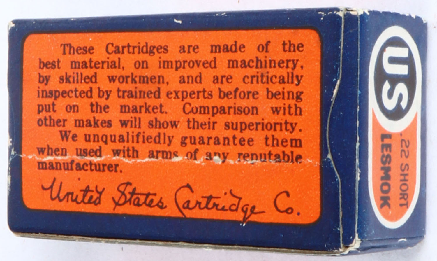 U.S., Lesmok Cartridges, .22 Short, RHWeb: US-50 S-12, FULL & SEALED, 1pc. Blue orange & white box, box is solid with excellent color, very minor edge & corner wear, side sealing label is intact. Grade: Excellent + - Value: 6 to 30