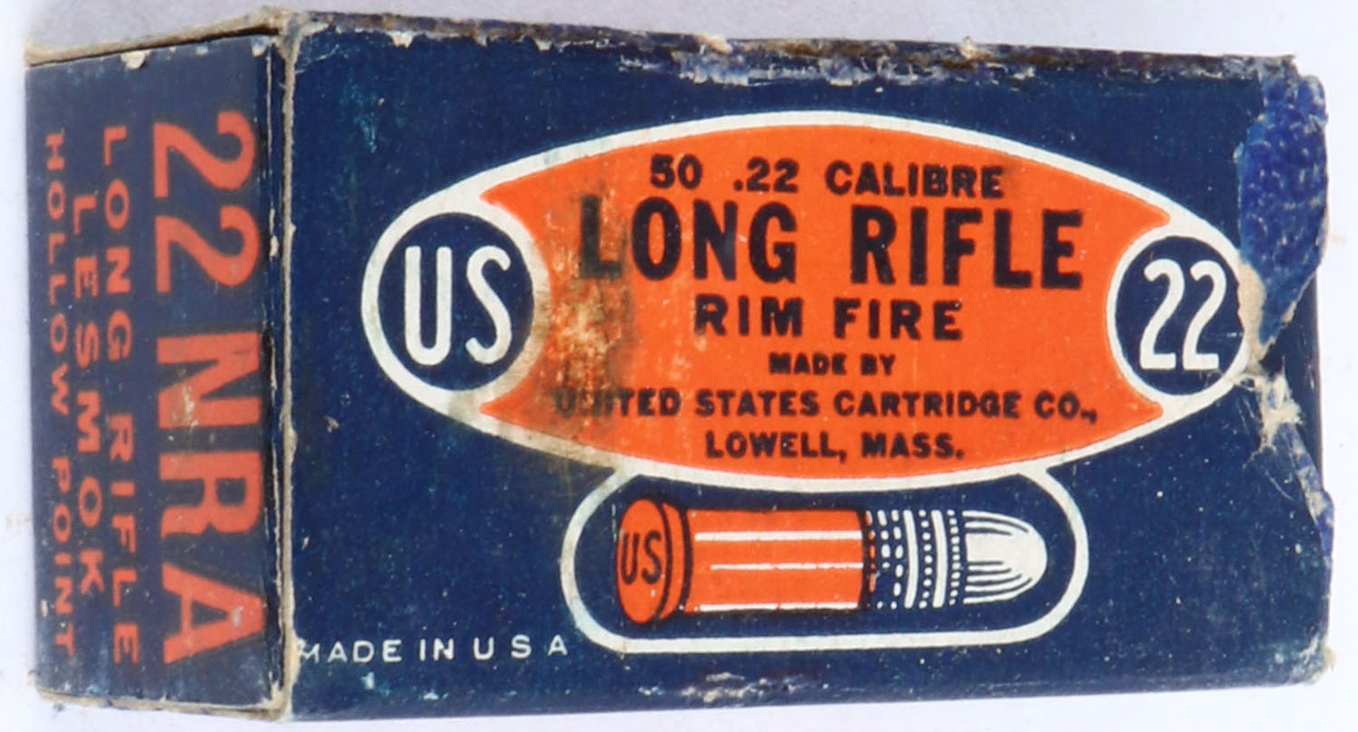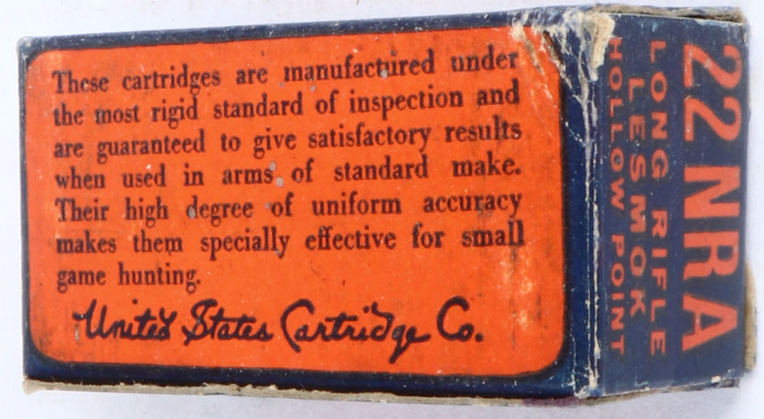 U.S., 22 NRA, .22 Long Rifle Hollow Point, RHWeb: US-51 LR-10, Partial 49rds. 1pc. Blue orange & white box, box is solid with excellent color, minor shelf wear, stain on top, partial seam split on top back edge that has been repaired, color repair to right end, some edge & corner wear, end flaps are solid, ammo is very good. Grade: Very Good - Value: 10 to 50