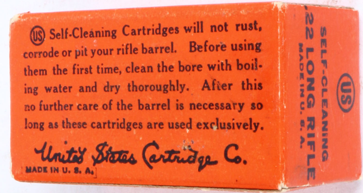 U.S., Self-Cleaning, .22 Long Rifle, RHWeb: US-10A LR-1c, Full, 1pc. Orange & black box, box is solid with excellent color, minor edge & corner wear, end flaps are solid, ammo is very good to excellent. Grade: Excellent + - Value: 20 to 60