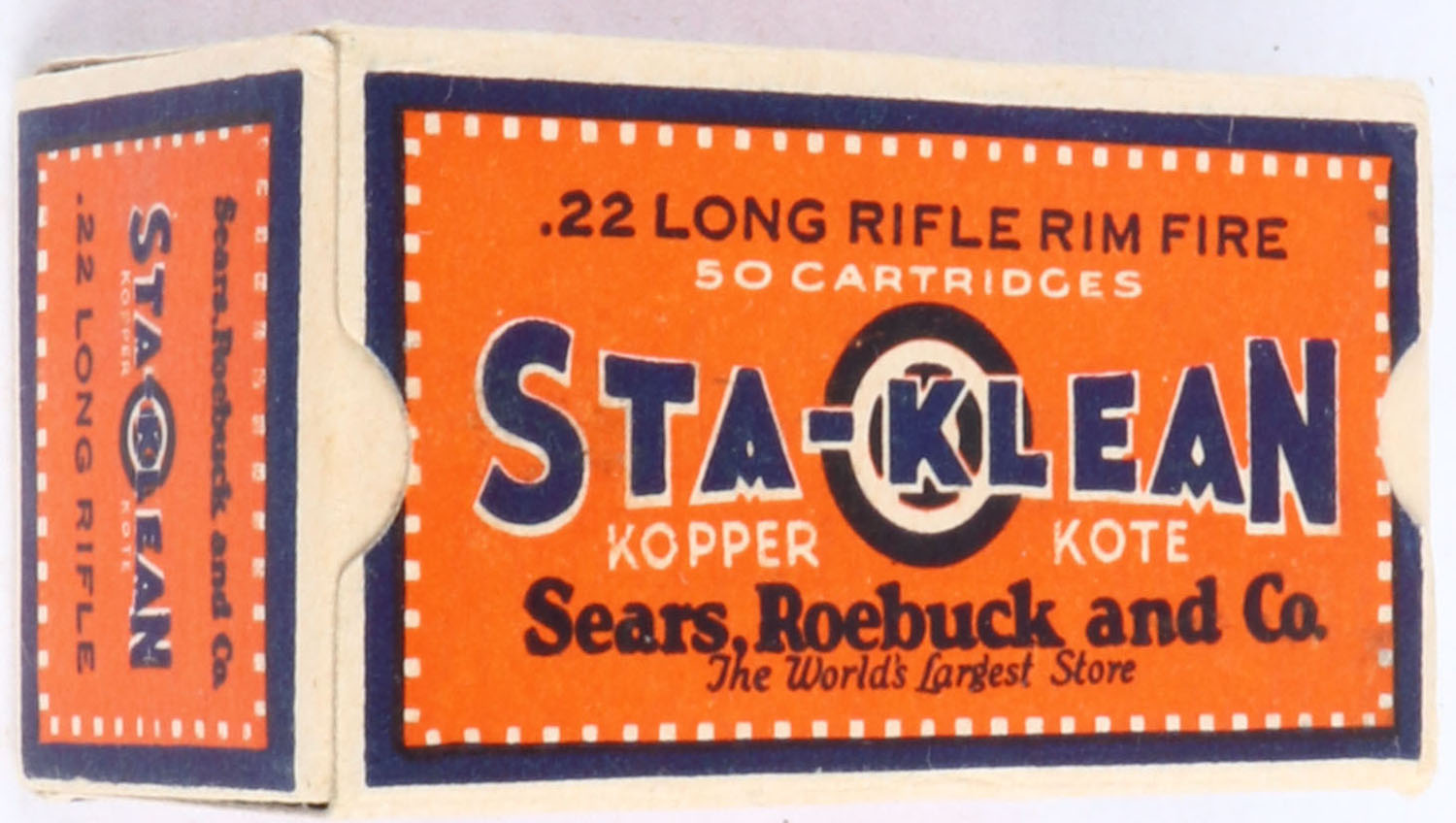 Sears, Sta-Klean, .22 Long Rifle, Kopper Kote, RHWeb: SEARS-3 LR-1a, Full, 1pc. Orange blue & buff box, box is near mint with minty color, only very minor corner wear, edges are crisp, end flaps are solid, ammo is excellent. Grade: Excellent ++ - Value: 20 to 60
