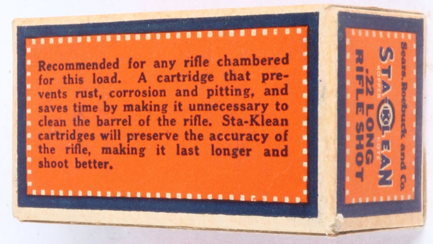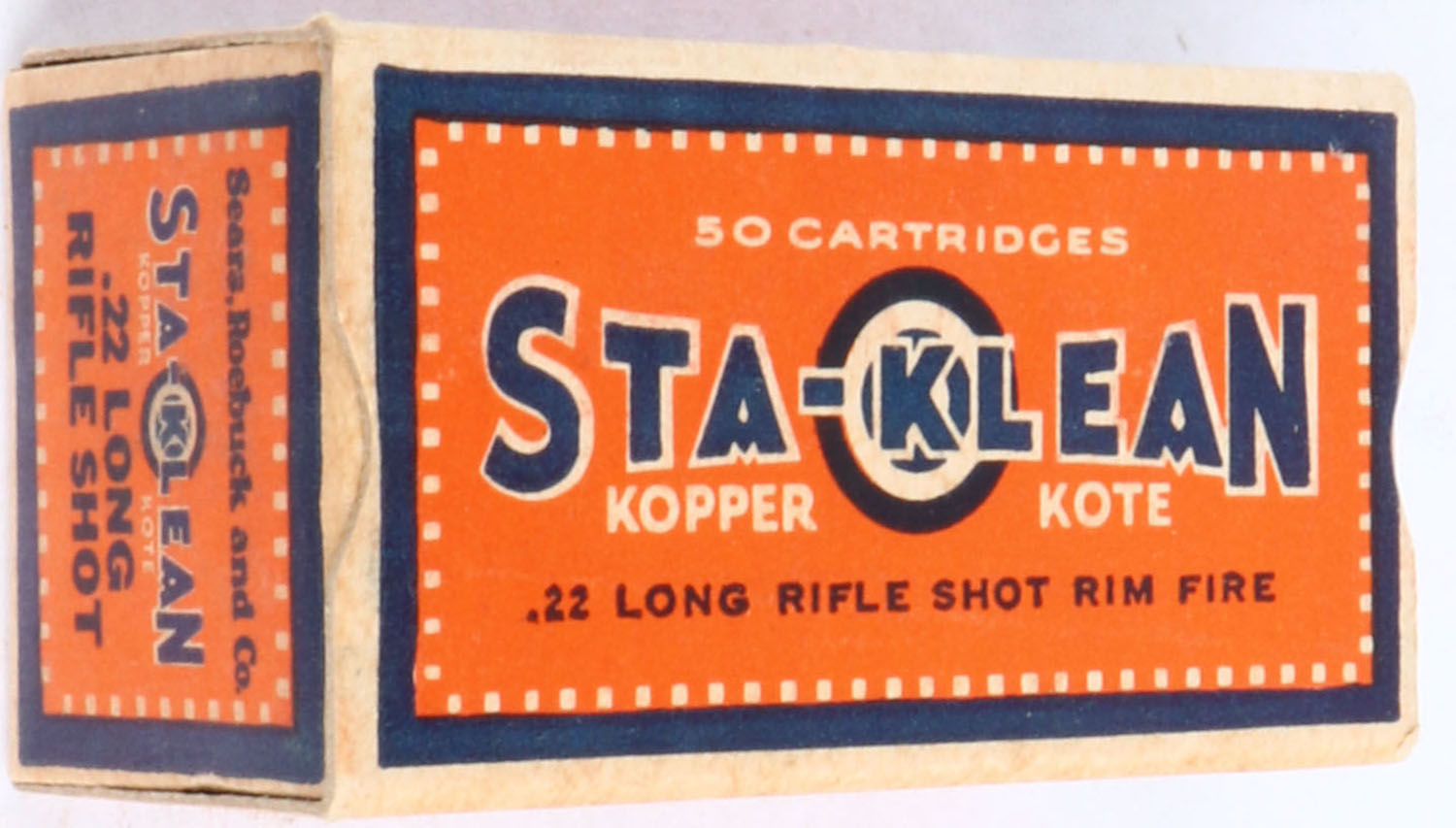 Sears, Sta-Klean, .22 Long Rifle Shot, Kopper Kote, RHWeb: SEARS-3 LR-3, Full, 1pc. Orange blue & buff box, box is solid with excellent color, minor age soiling, corners are mostly sharp, edges are crisp, end flaps are solid, ammo is excellent. Grade: Excellent + - Value: 30 to 90