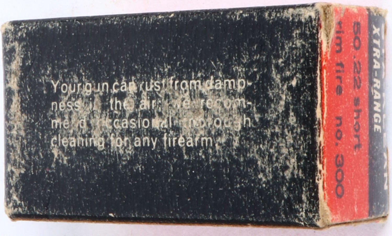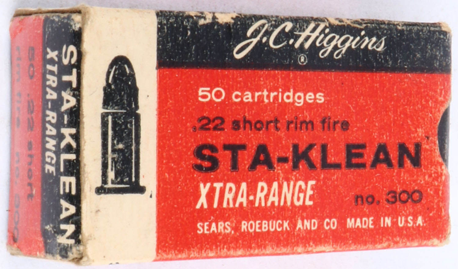 Sears, J.C. Higgins Sta-Klean, .22 Short, no. 300 Xtra-Range, RHWeb: SEARS-9 S-1, Partial 48rds., 1pc. Red black & white box, box is solid with very good color, some age soiling & shelf wear, some corner wear, minor edge wear, end flaps are solid, ammo is excellent. Grade: Very Good ++ - Value: 2 to 20
