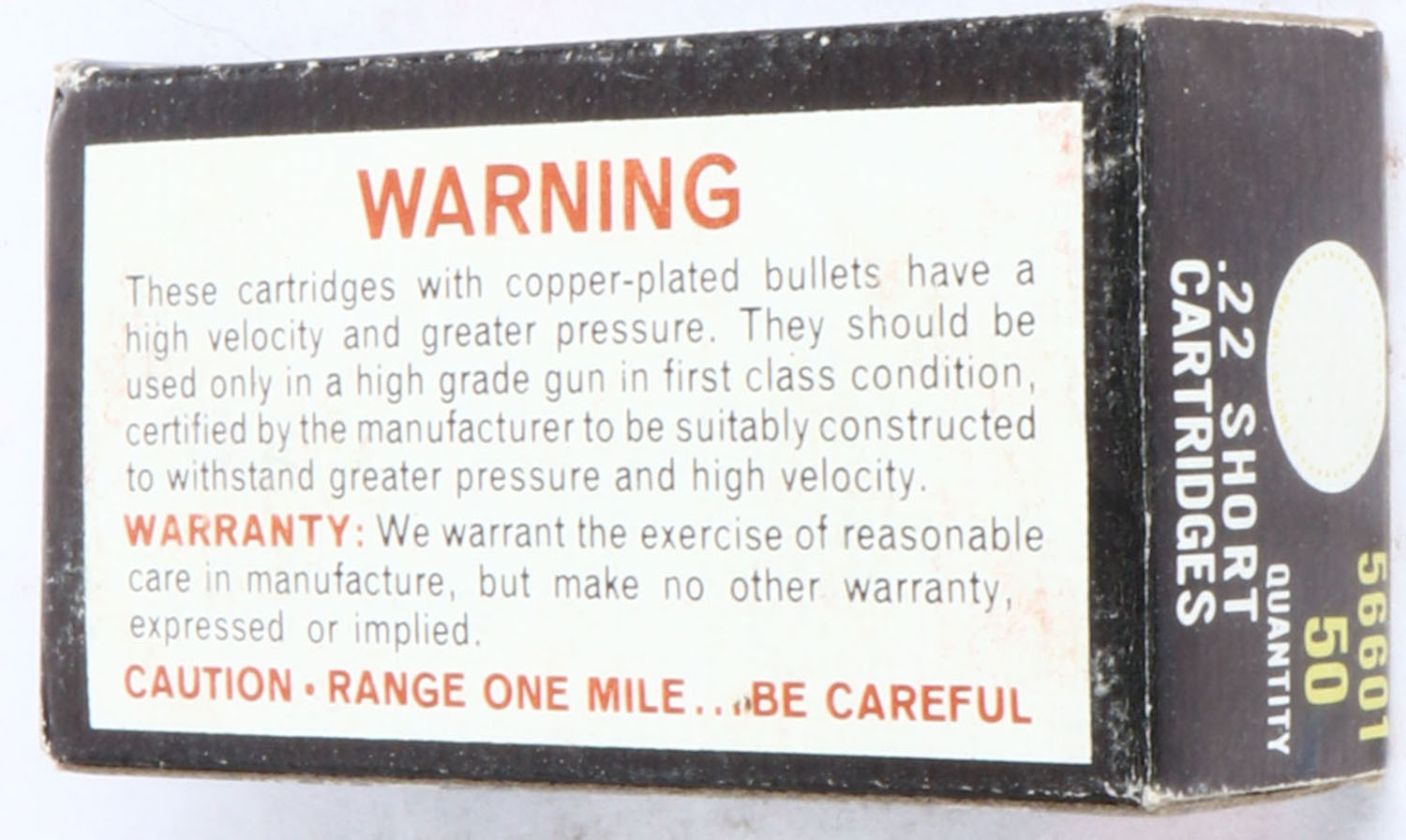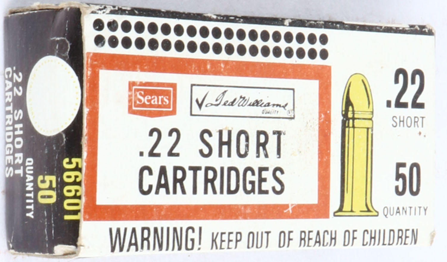 Sears, Ted Williams, .22 Short, RHWeb: SEARS-13 S-1, Full, 1pc. White black & red box, box is solid with excellent color, very minor shelf wear, minor corner wear, edges are mostly crisp, end flaps are solid, ammo is minty. Grade: Excellent + - Value: 10 to 50