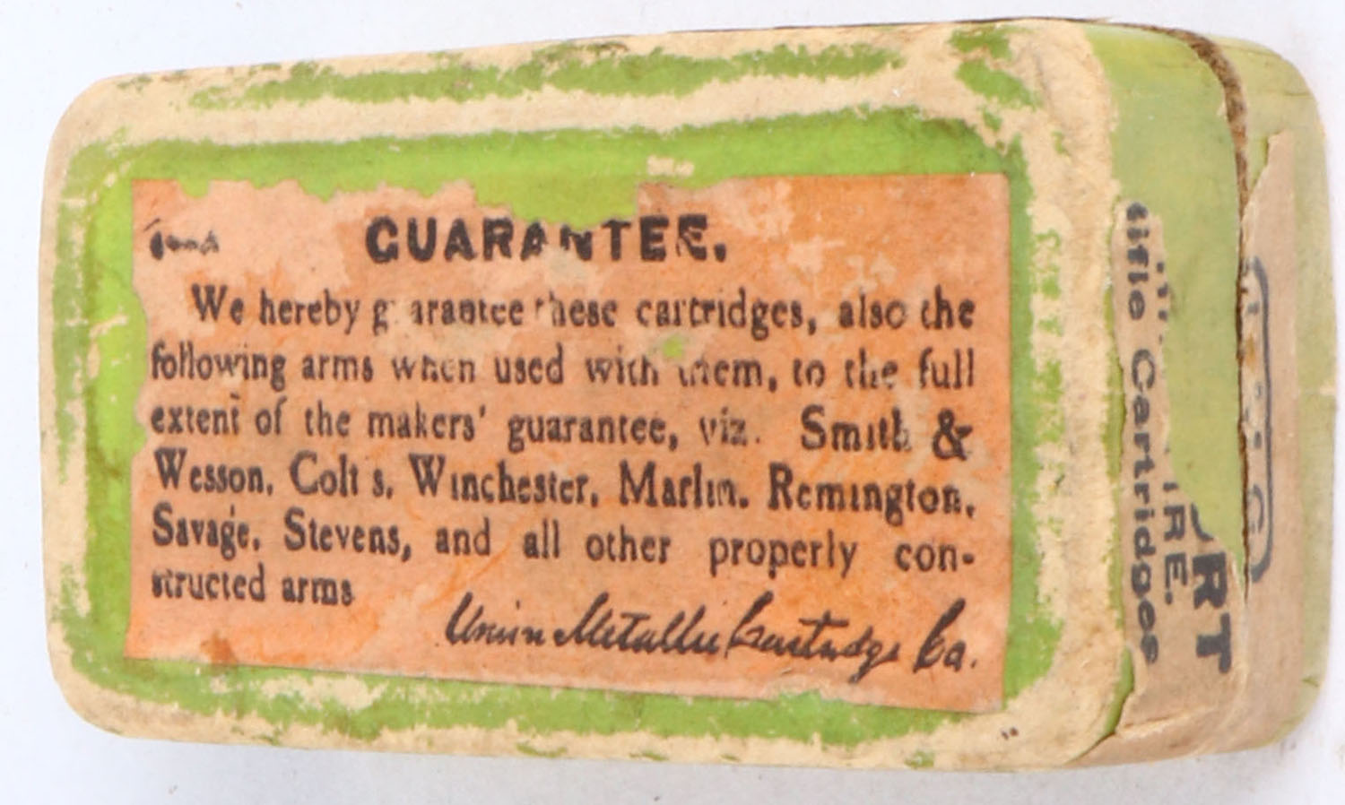 UMC, Rim Fire Cartridges, .22 Short, Swaged Bullets, RHWeb: UMC-8 S-3.1, Full, 2pc. Green box with red top & buff side sealing labels, box is solid with excellent color, minor age soiling, some edge & corner wear, side sealing label is 50% intact, ammo is very good. Grade: Very Good ++ - Value: 10 to 50