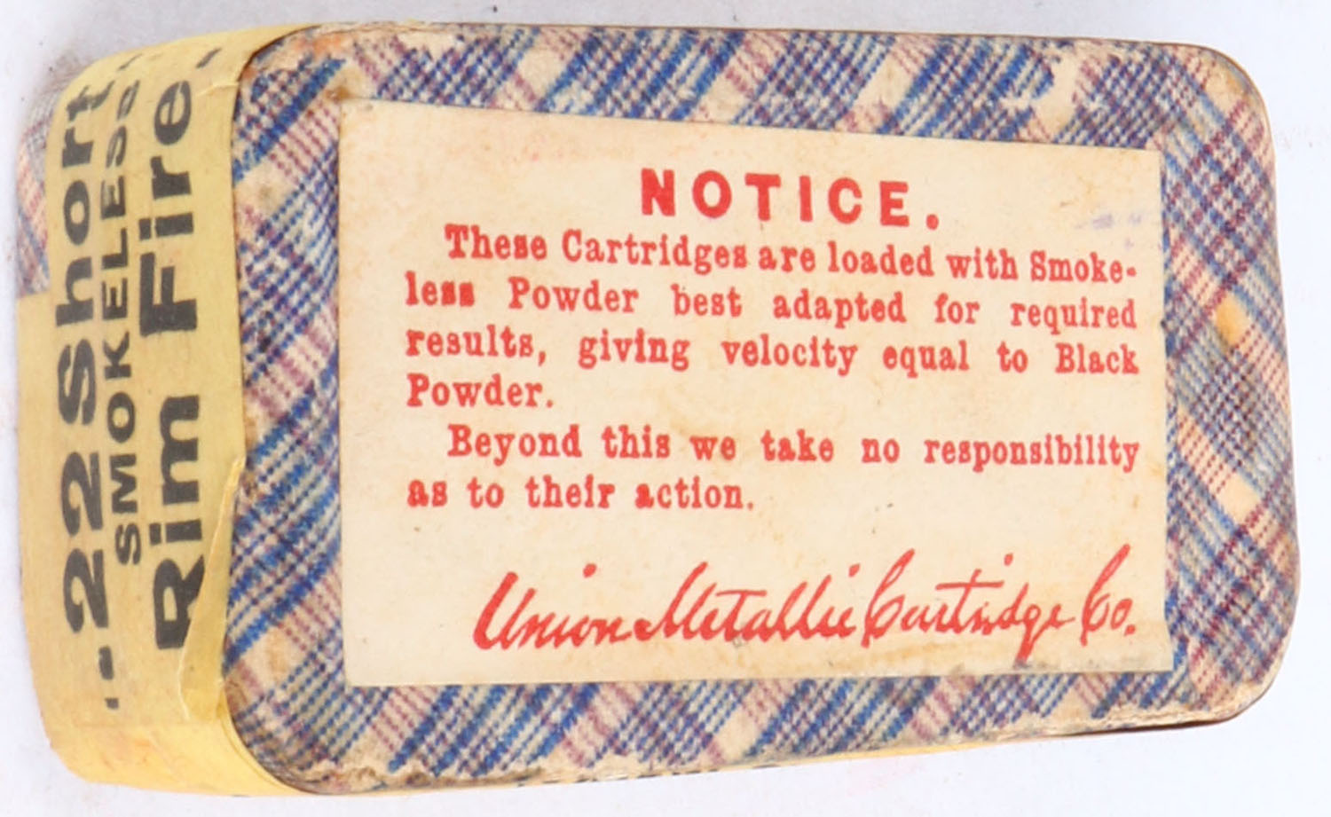 UMC, Rim-Fire Cartridges, .22 Short, Smokeless, RHWeb: UMC-8 S-8b, FULL & SEALED, 2pc. Purple fabric box with yellow top & side sealing labels, box is solid with excellent color, only very minor age soiling & edge wear, labels are intact. Grade: Excellent ++ - Value: 40 to 120