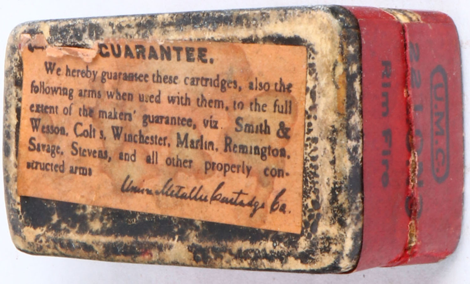 UMC, Rim-Fire Cartridges, .22 Long, Swaged Bullets, RHWeb: UMC-8 L-1a, FULL & SEALED* 2pc. Black mottled box with red top & side sealing labels, box is solid with very good to excellent color, minor age soiling, some shelf wear, minor edge & corner wear, labels are intact, side sealing label partially unsealed in front. Grade: Very Good ++ - Value: 150 to 300
