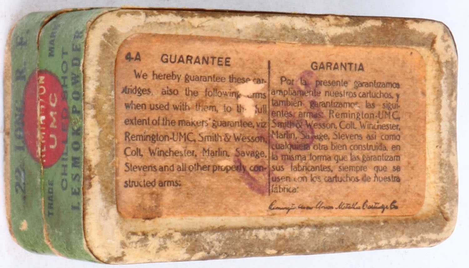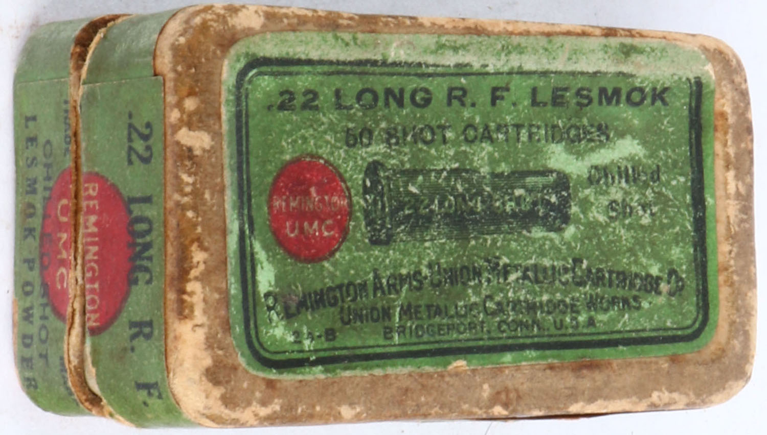REM-UMC, R.F. Lesmok, .22 Long Shot, RHWeb: REM-2 L-4b, Partial 17rds., 2pc. Buff box with green top & side sealing labels, box is solid with good color, age soiling, some shelf wear, some edge wear, minor corner wear, labels are intact. Grade: Very Good + - Value: 10 to 50