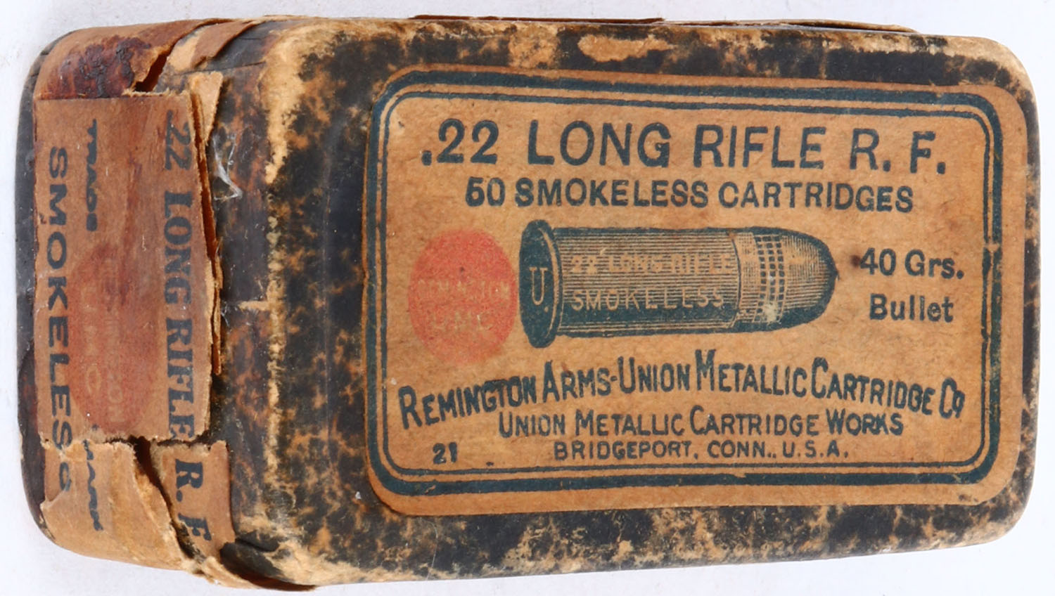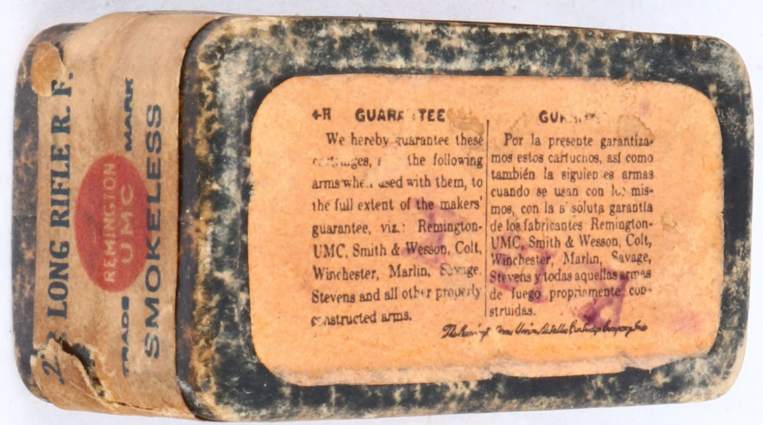 REM-UMC, .22 Long Rifle, Smokeless Cartridges, RHWeb: REM-2 LR-5c, FULL & SEALED, 2pc. Black mottled box with buff top & side sealing labels, box is solid with very good color, age soiling minor edge & corner wear, labels are intact. Grade: Very Good ++ - Value: 20 to 80