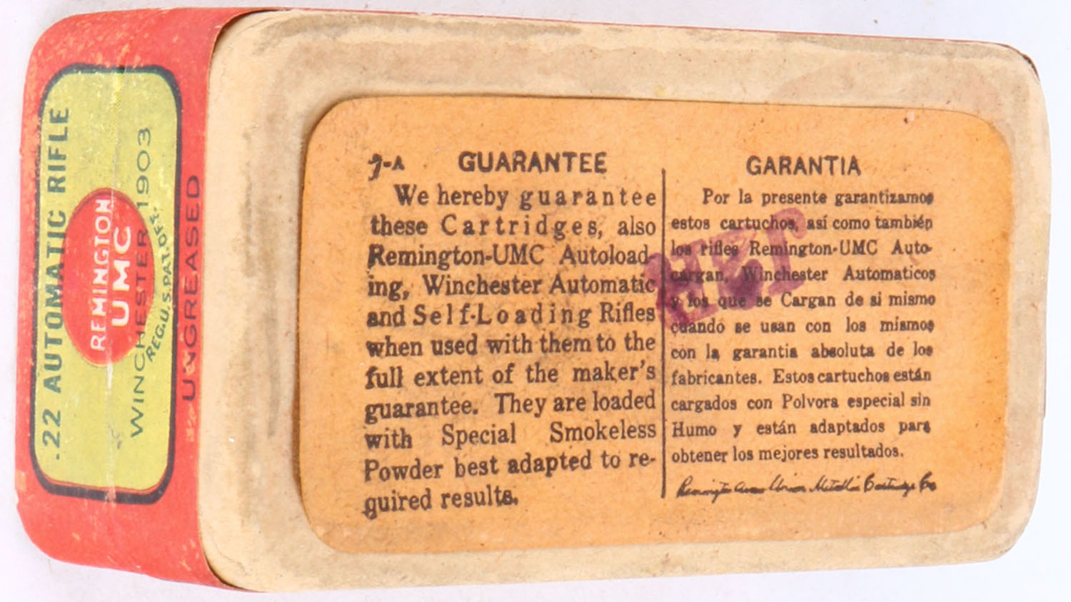 REM-UMC, .22 Winchester Automatic, Smokeless, RHWeb: REM-2 WA-1c, FULL & SEALED, 2pc. Buff box with green/red top & side sealing labels, box is solid with excellent color, very minor age soiling, very minor shelf wear, corners are mostly sharp, edges are mostly crisp, labels are intact. Grade: Excellent + - Value: 30 to 90