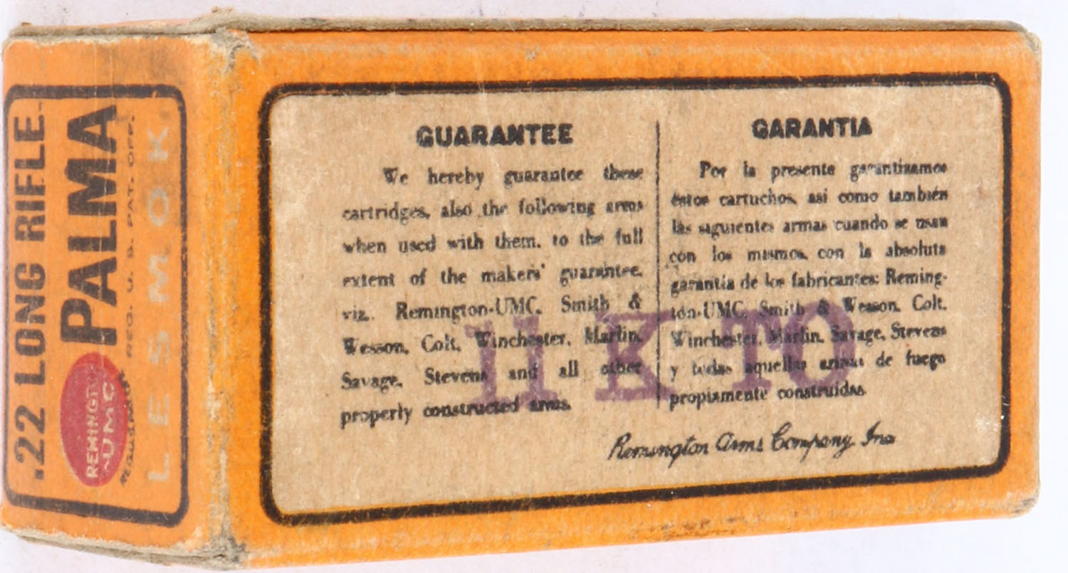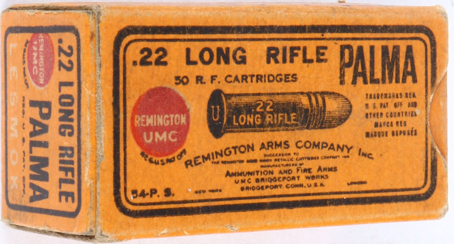 REM-UMC, Palma, .22 Long Rifle, RHWeb: REM-52 LR-1b, Full, 1pc. Orange box, box is solid with excellent color, very minor age soiling & corner wear, edges are mostly crisp, end flaps are solid, ammo is very good. Grade: Excellent + - Value: 30 to 90