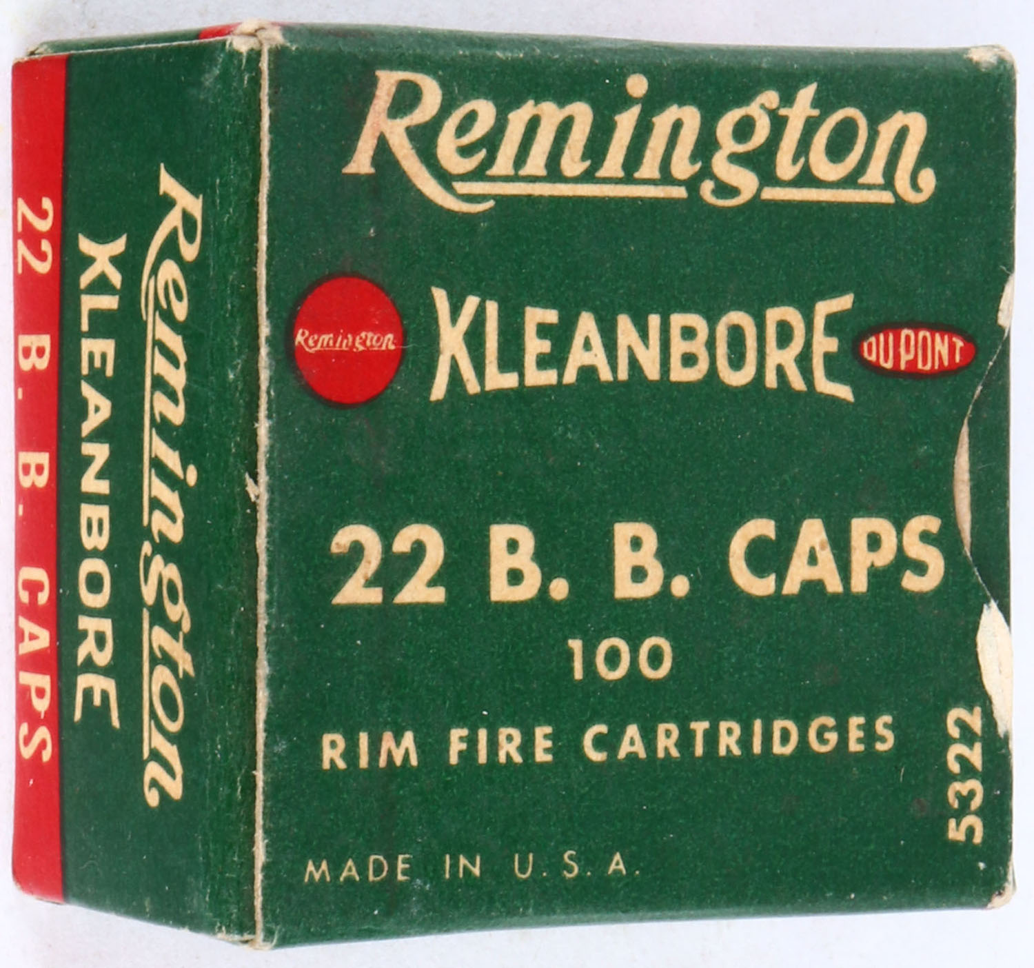 Remington, Kleanbore, .22 B.B. Caps, RHWeb: REM-12 BB-1b, Full, 1pc. Green white & red box, box is solid with excellent color, very minor age soiling & corner wear, edges are crisp, end flaps are solid, ammo is excellent. Grade: Excellent + - Value: 20 to 60