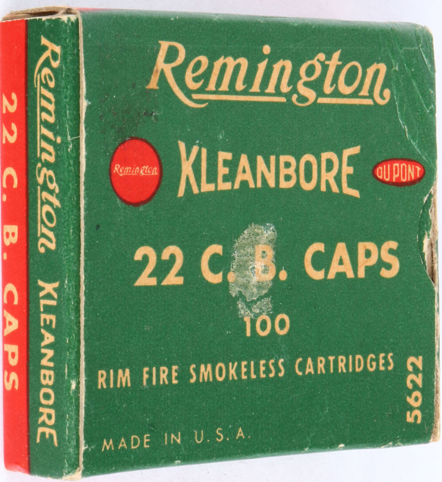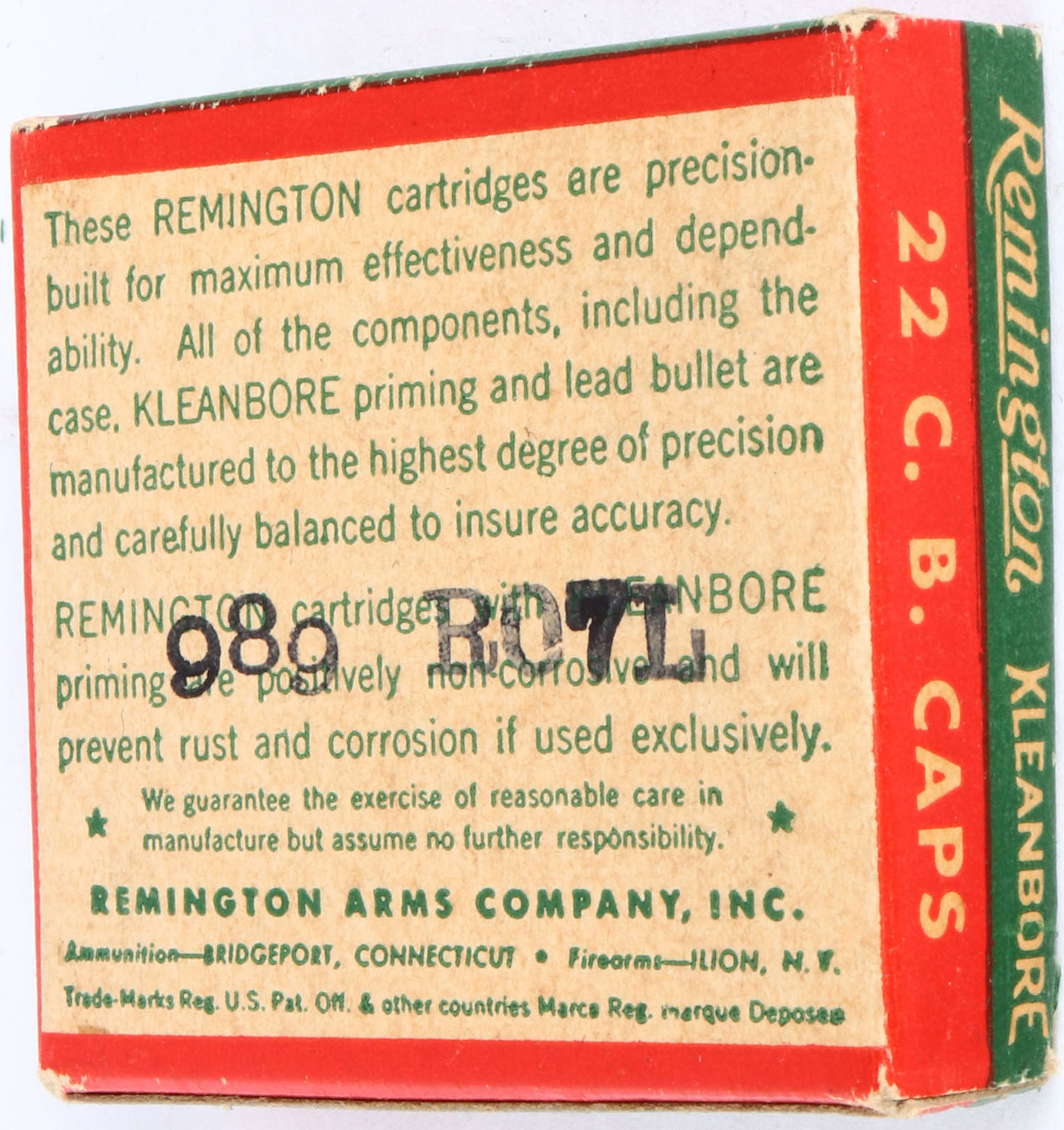Remington, Kleanbore, .22 C.B. Caps, RHWeb: REM-12 CB-2 Full, 1pc. Green white & red box, box is solid with excellent color, some age soiling, stain on top, partial seam split to insert tab of right end flap, corner ding on back right corner, edges are mostly crisp, end flaps are solid, ammo is excellent. Grade: Very Good ++ - Value: 20 to 60