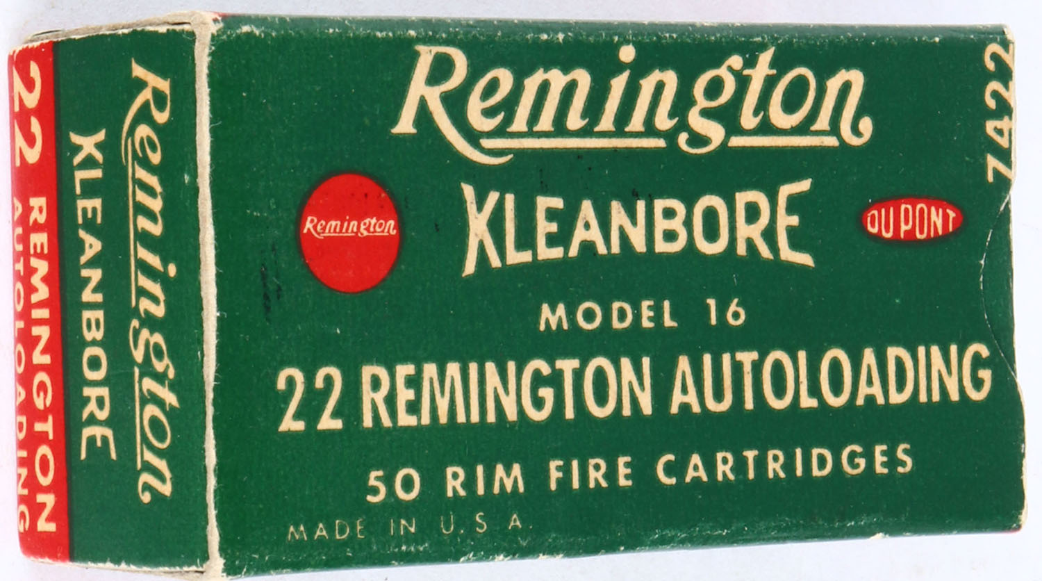 Remington, Kleanbore, .22 Remington Autoloading, RHWeb: REM-12 RA-1b, Partial 49rds., 1pc. Green white & red box, box is solid with excellent color, very minor edge & corner wear, end flaps are solid, ammo is excellent. Grade: Excellent + - Value: 50 to 150