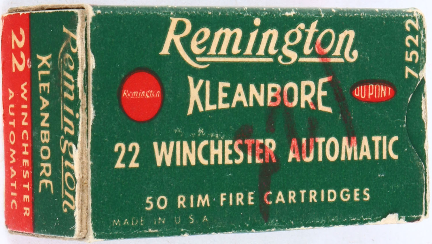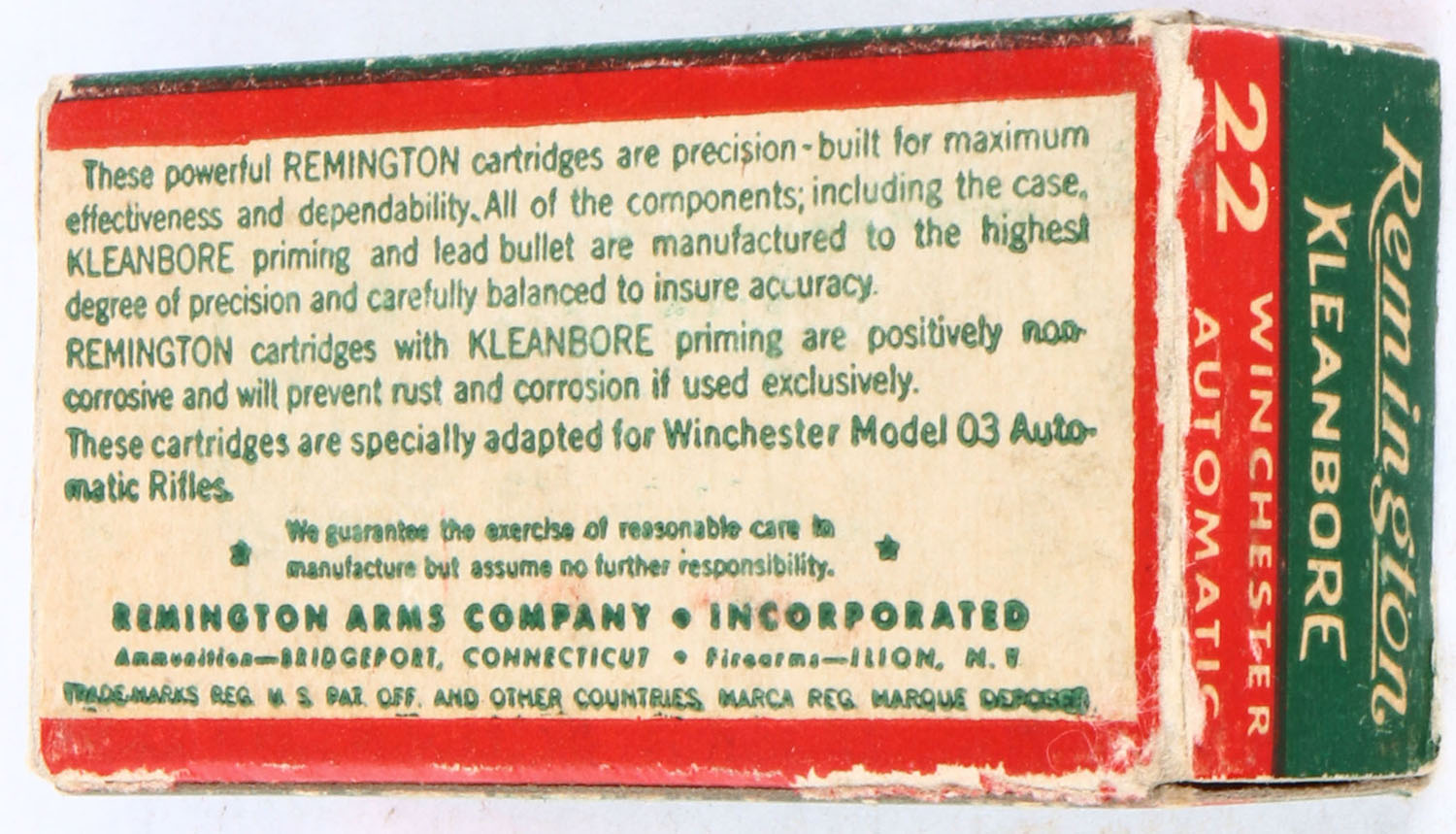 Remington, Kleanbore, .22 Remington Autoloading, RHWeb: REM-12 RA-1b, Partial 43rds correct, 1pc. Green white & red box, box is solid with very good to excellent color, some age soiling, minor staining on top, corner ding on top front corner, edge & corner wear, end flaps are solid, ammo is excellent. Grade: Very Good + - Value: 20 to 80