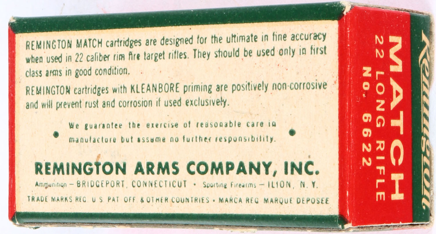 Remington, Match, .22 Long Rifle, For Rifle Shooting, RHWeb: REM-54 LR-1a, Full, 1pc. Green red & white box, box is solid with excellent color, very minor age soiling & corner wear, edges are crisp, end flaps are solid, ammo is excellent. Grade: Excellent + - Value: 20 to 60