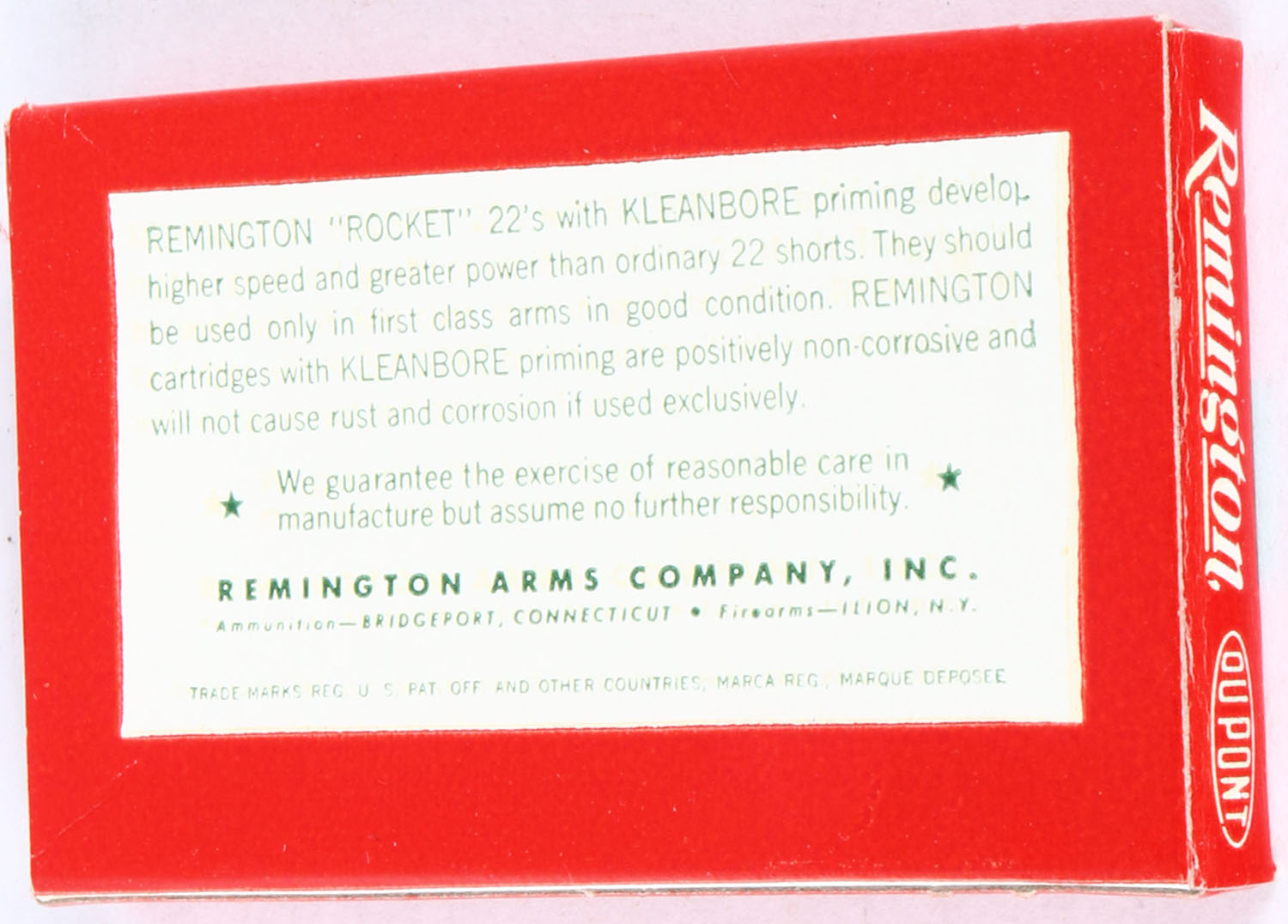 Remington, ''Rocket'', .22 Short, RHWeb: REM-14 S-5, Full, 1pc. Red green & white box, box is MINT (minus original packaging) with minty color, corners are sharp, edges are crisp, end flaps are solid, ammo appears mint. Grade: MINT - Value: 20 to 60